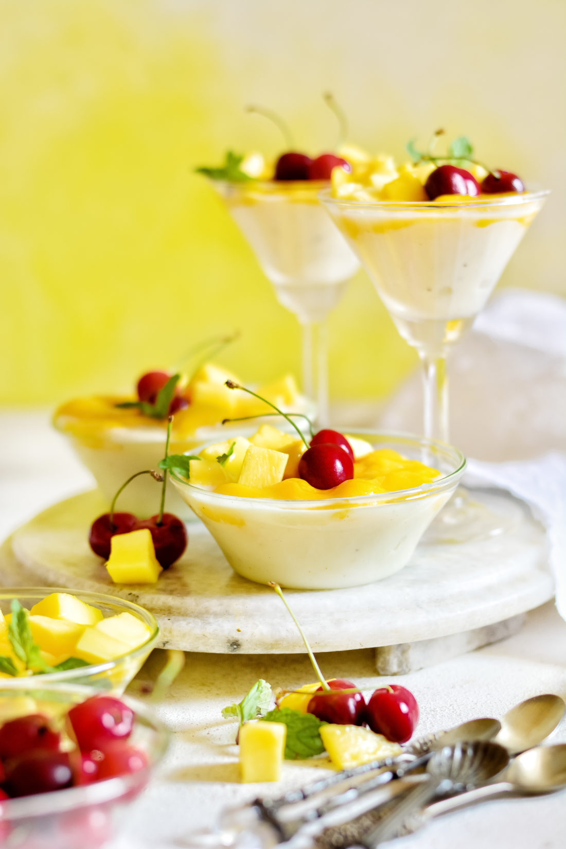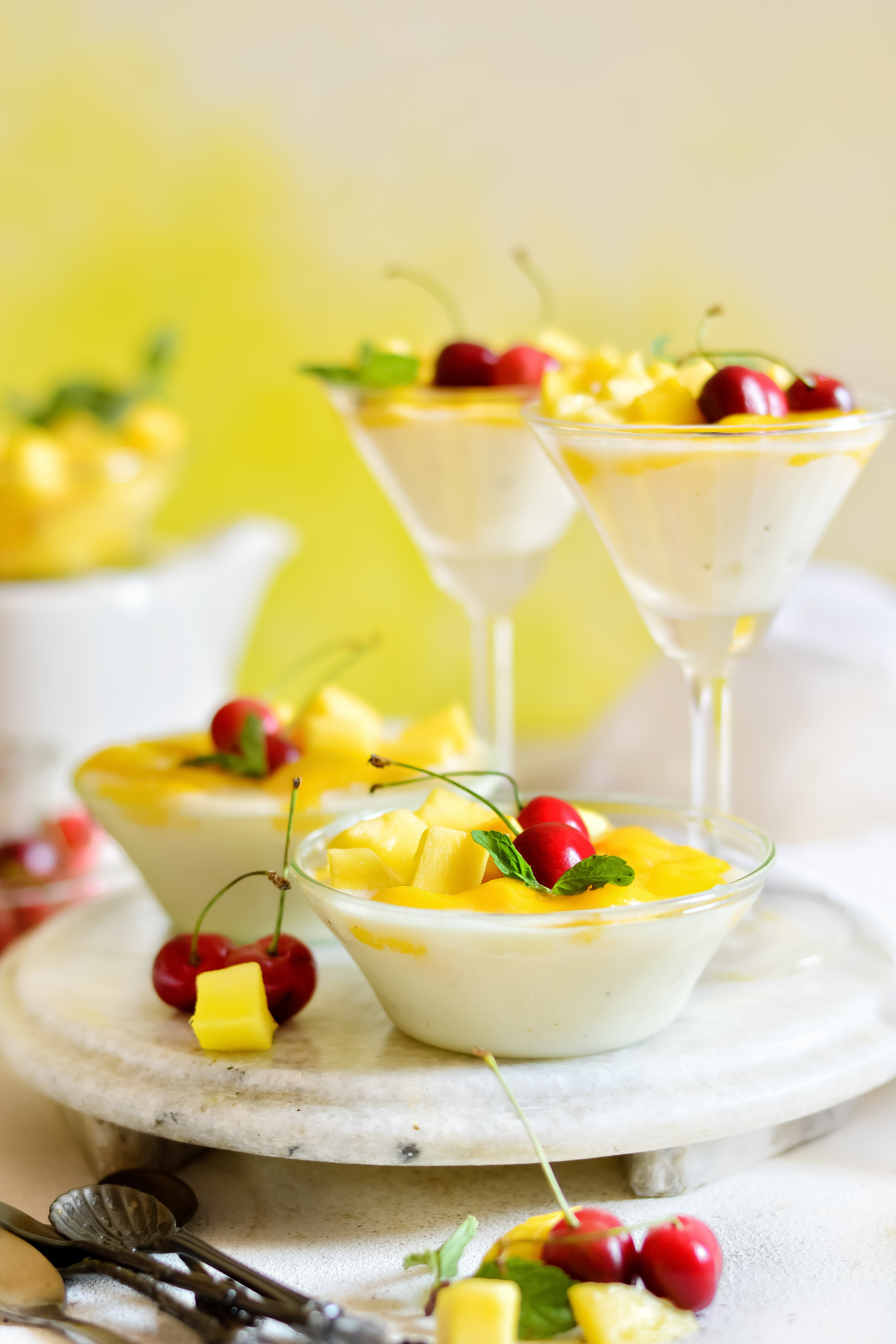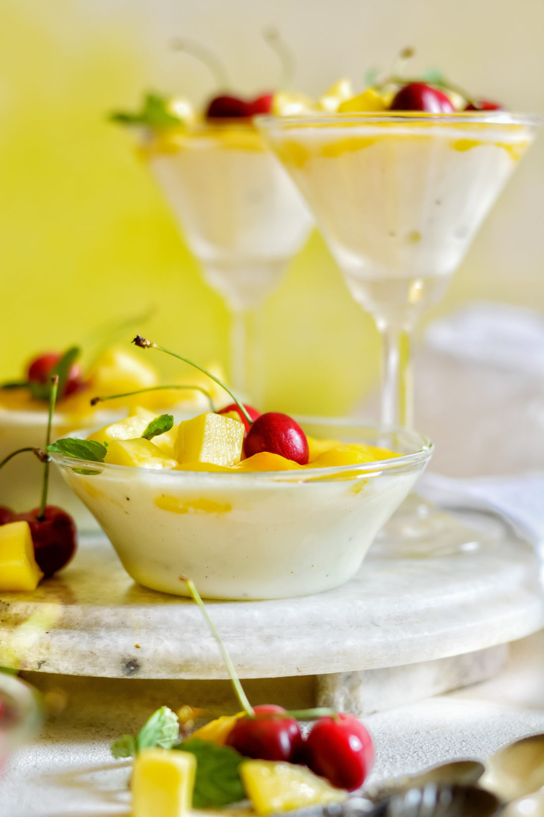 - Add spoonful of shrikhand in a serving bowl, top it with some mango pulp (if needed), add some chopped mangoes, cherries and garnish with a mint leaf.