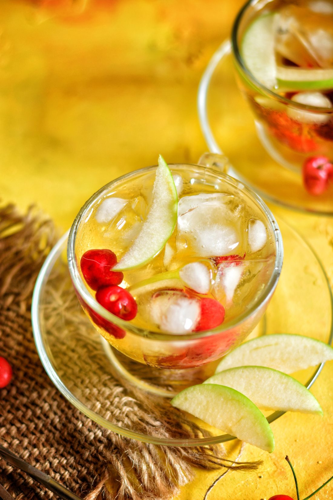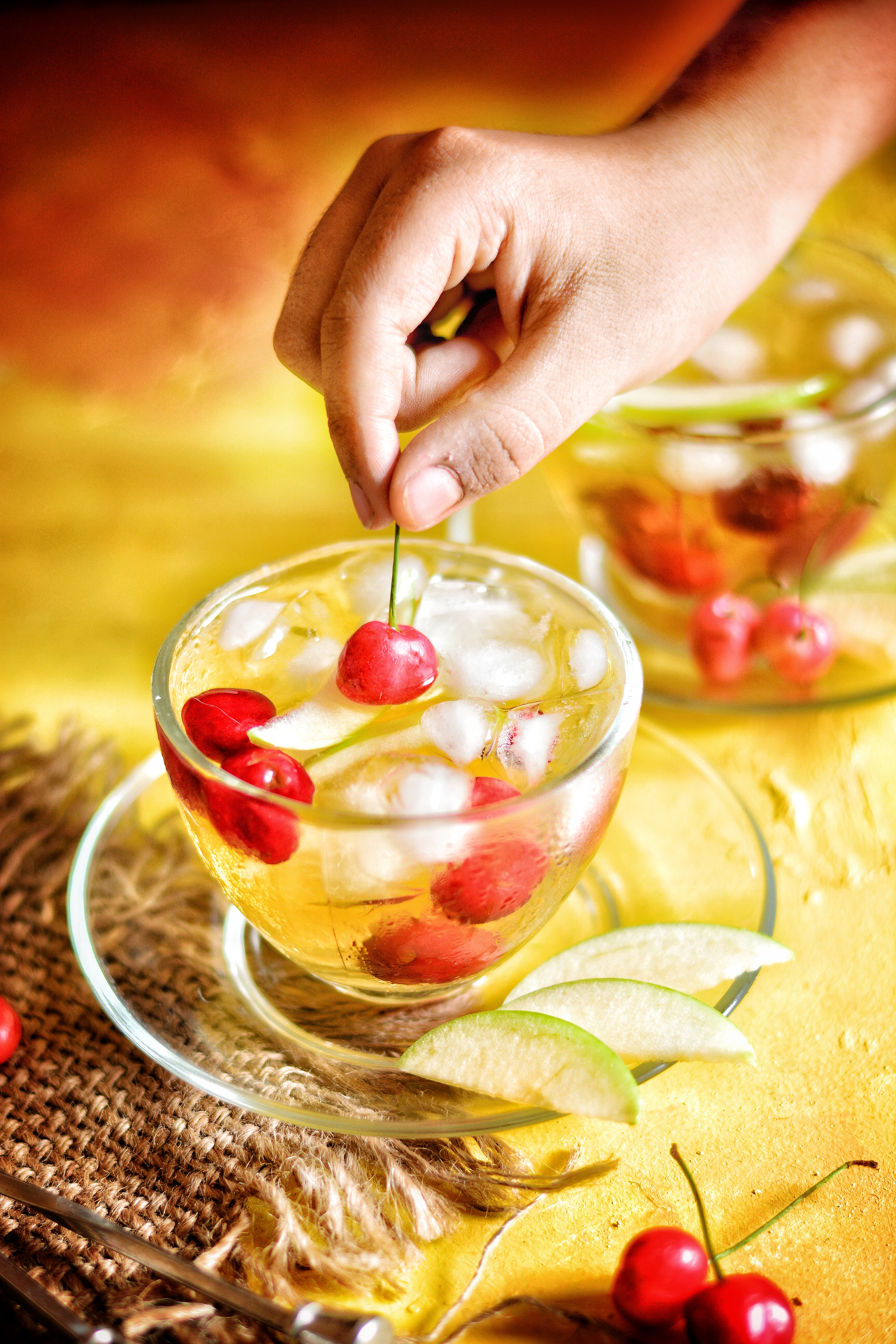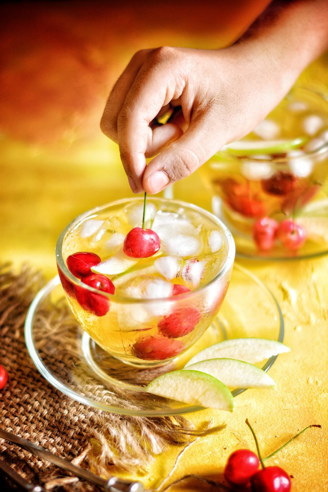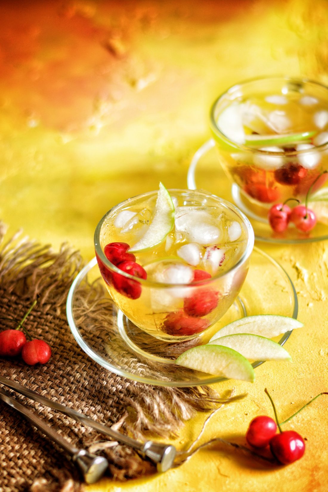 To make this summer thirst quencher all you have to do is prepare green tea brew, strain and collect in a decanter. Add apple concentrate, honey, mix well and refrigerate. For making iced drink, take 1/4 cup of tea mix, add chilled water, sweetener (honey if needed), cherries, mint leaves. Gently pound the cherries and mint with a spoon and stir. Serve chilled.