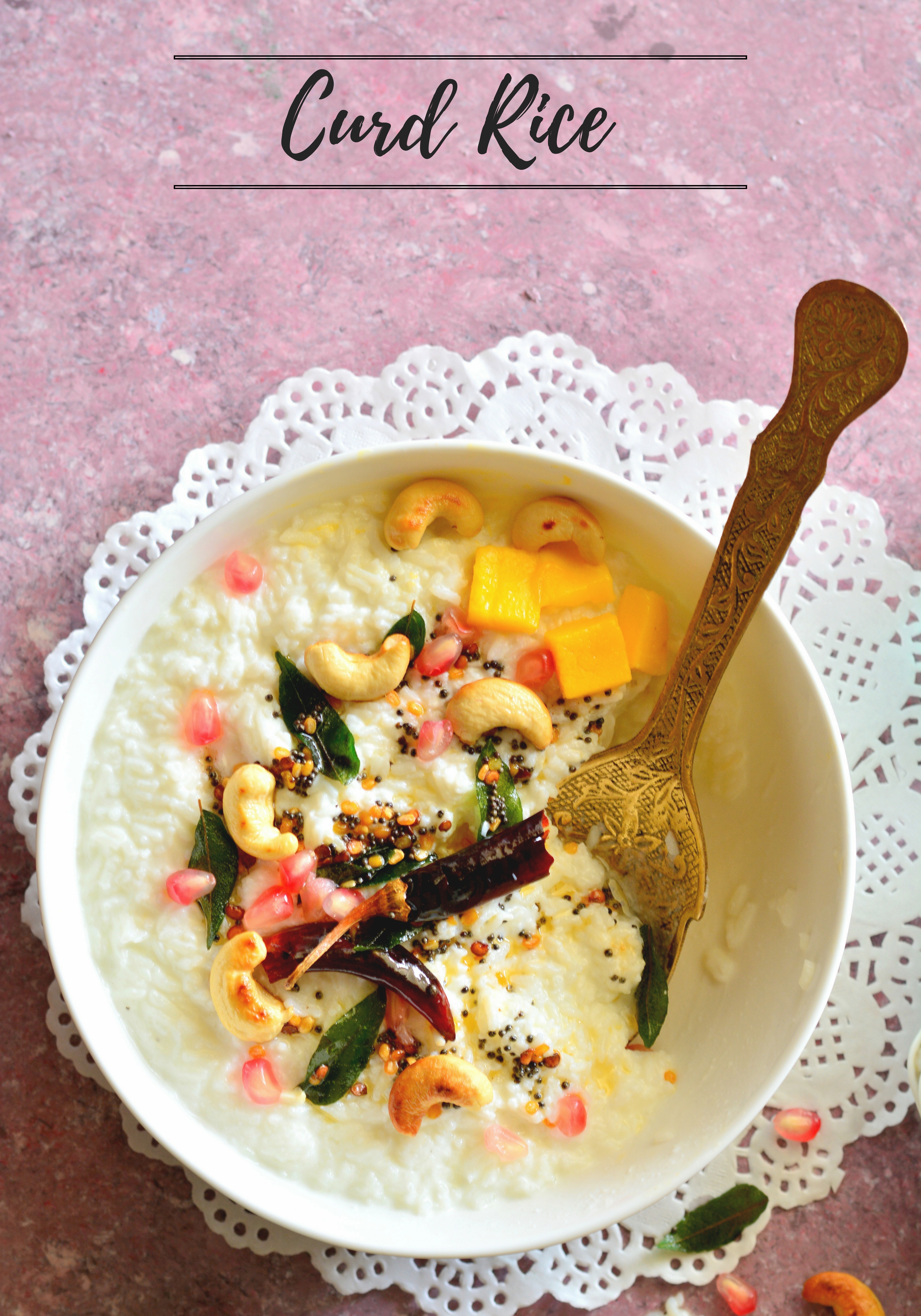 Curd Rice is also called yogurt rice is a dish of India. The word “curd” in India usually refers to unsweetened yogurt. It is very popular in the Indian states of Tamil Nadu, Karnataka, Andhra Pradesh and Kerala.
