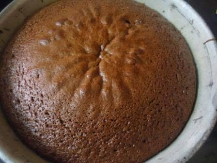 - Now cut the cake horizontally into two parts from the center. (If you have two similar sized baking tins then u can divide the given ingredients into half and bake two individual cakes too)