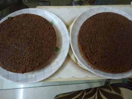 - Once the second cake is done, allow it to cool and again cut it horizontally into two parts and brush it with the sugar syrup as done in the first cake.