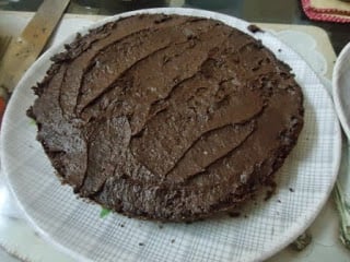 - Take out ganache from the refrigerator and whip it well again. Now with a flat spatula apply ganache on one half of the first cake (bigger one) generously.