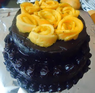 4th May we celebrated her birthday and this time she wanted me to bake a cake for her. As it is raining mangoes everywhere and the fruit is also supposed to be a favorite of all in my house, i thought to design the cake with Mango rosettes. My mom was very clear with her choice that she wanted a dark chocolate cake frosted with chocolate ganache. So i knew what to make and how to make.