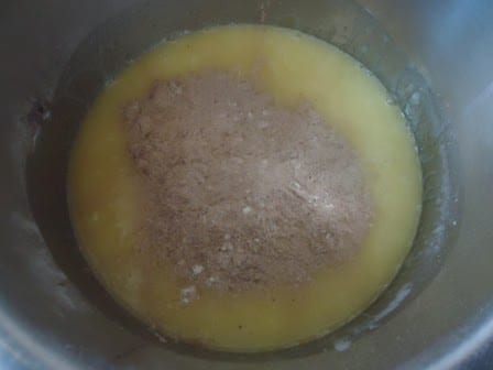 - Now start adding the dry ingredients to the wet ingredients slowly to make a smooth and fine chocolaty batter.