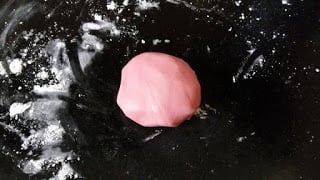 - Now take a portion and add your choice of color and knead it well by greasing your hands with vegetable shortening again. This will add a sheen to the dough. I wanted to make daizy flowers hence i added pink color to a portion.