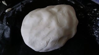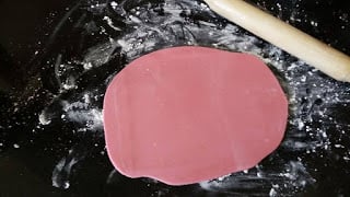- Transfer the assembled dough on a dusted counter (dust it with icing sugar) , grease your hands with vegetable shortening and start kneading it again to make a soft and supple dough. The dough should be elastic and the consistency should be exactly like the kids play dough. If you find your dough dry, you can add little water and knead it again. To get a perfect fondant dough you will have to knead it really well and this may take around 8-10 mins.