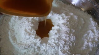 - As soon as the gelatine mix is cool, make a well in the center of the icing sugar and pour in the liquid mix. Now start folding the icing sugar inwards to make dough
