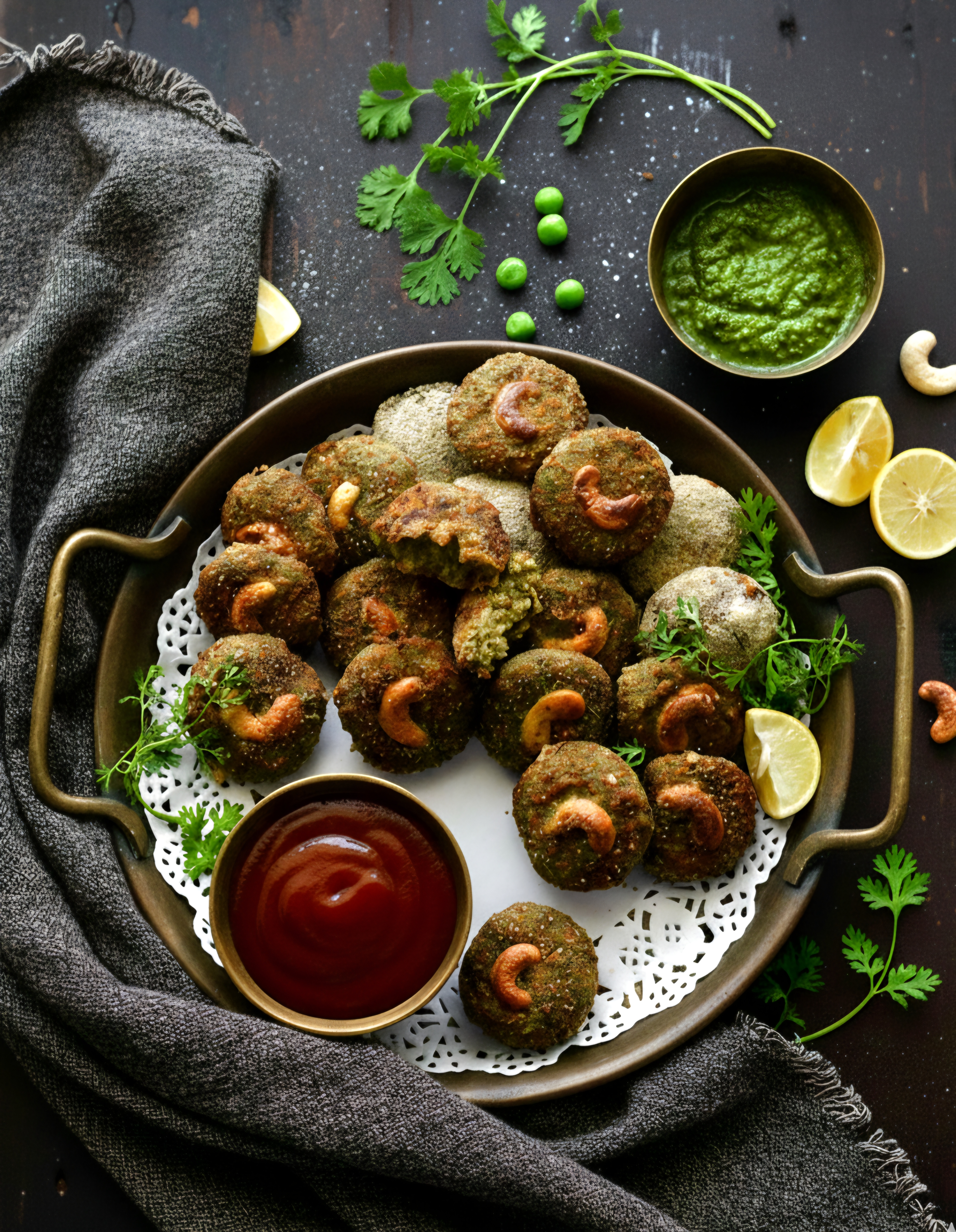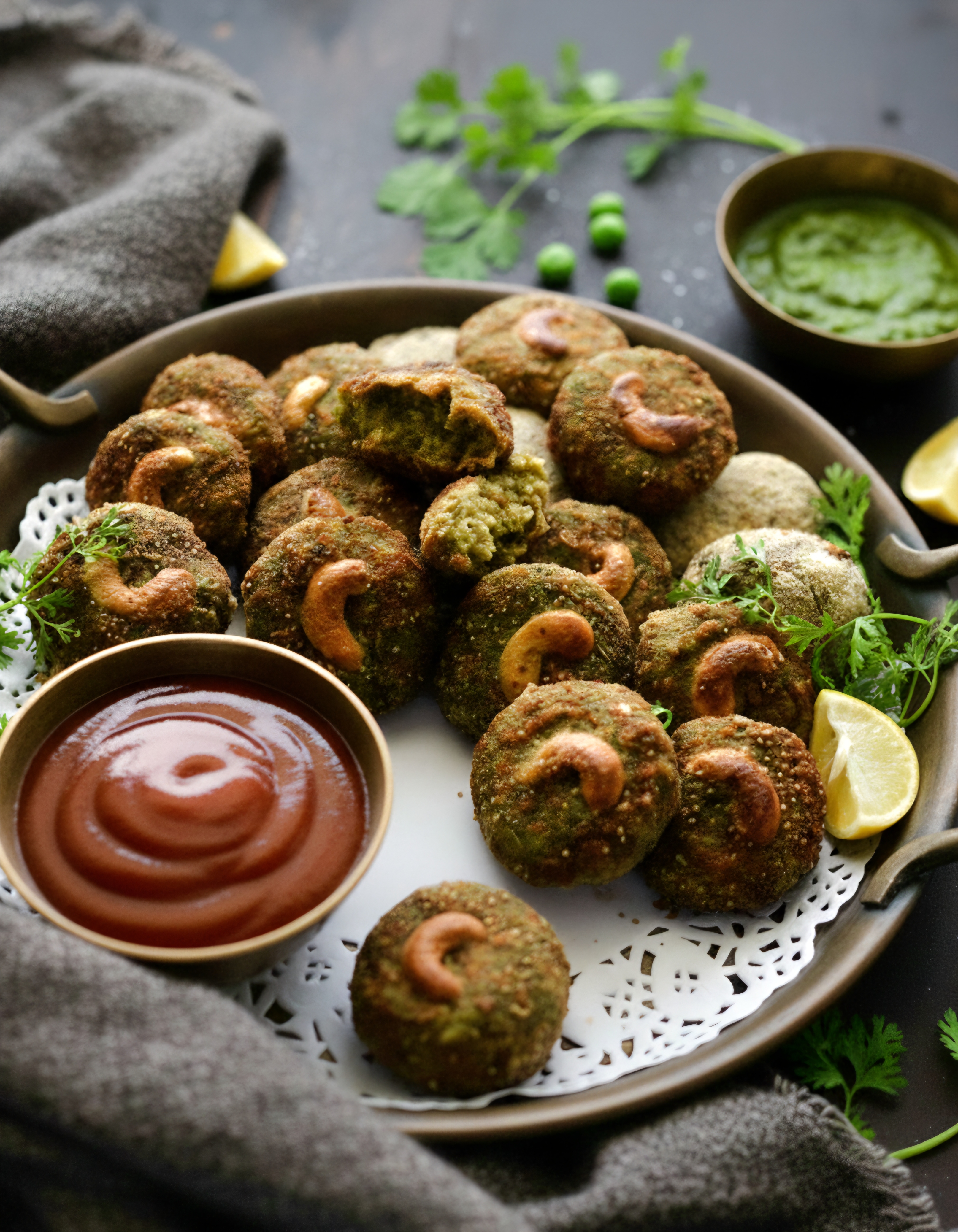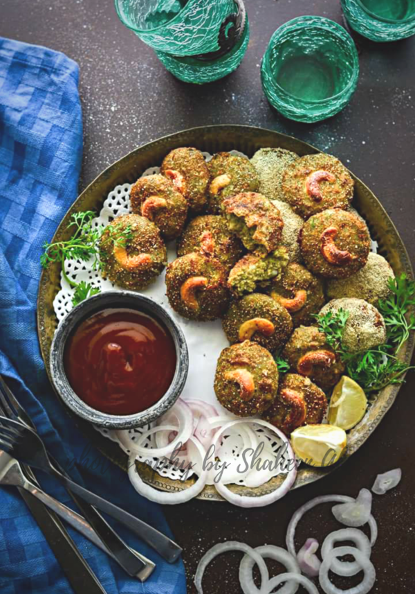 Hey beautiful people! It’s weekend again and when it rains my weekend gets to be extra special. Yes I love rains and I love snacks that we enjoy sitting in our balcony watching the tipper tapper outside. Isn’t it amazing? So here’s my family’s favorite snack that we enjoy in monsoons and yes its also one of the most popular party appetizer these days. Small coin shaped green kebabs decord with a cute lil cashew is crunchy outside and absolutely melt in mouth inside. The color green comes from Spinach and green peas…though I use some boiled potatoes and bread crumbs for binding but you can also use paneer to make it a Lil more rich. Check out the recipe, make it for your family or guests and do tell me how it was.