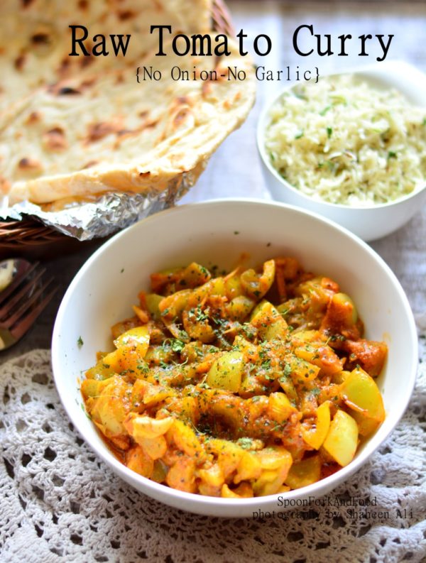 Raw Tomato Curry aka Hare Tamatar ki Sabzi is a spicy tangy, delicious side dish that comes from North Indian Cuisines. The recipe has passed on through various regions with different variations done, hence it doesn’t belong to any particular regional cuisine. A very popular dish in North Indian states like Rajasthan, Uttar Pradesh, Bihar etc, that goes well with roti/chapati/rice etc. Tomato is harvested in it’s green form or you can say when it is raw, chopped into pieces and then seasoned with Indian Spices. This particular recipe is made without Onion and Garlic hence making it close to the original was a challenge. Though i often make tomato sabzi with lots of burnt garlic and onion but in this recipe only raw tomatoes are used with some green chilies and dry spices.