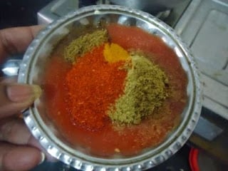 - Now add tomato puree and the spices and fry all together till the oil starts leaving from sides. If you don't have tomato puree, you can also add finely chopped tomatoes and fry well.