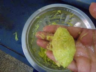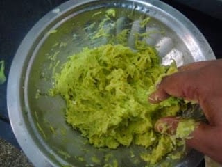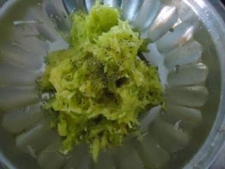 - Add little salt and turmeric powder and mix well. Now take handful of grated lauki between your palm and press nicely so that all the excess water gets drained out. [This is a very important step. Pls do not skip this.]