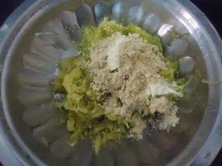 - Now add gram flour and mix well so that the lauki gets a nice binding. You can adjust besan as per your requirement. I like to keep the koftas fibrous so i added less besan.