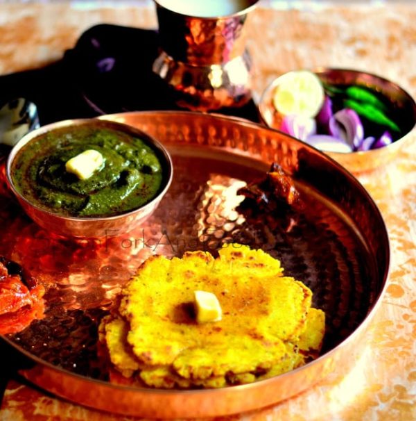 - Place the rotis in the serving plate and add a dollop of ghee or butter over the makka roti and serve hot with sarson ka saag, pickle, onion salad and chaas.