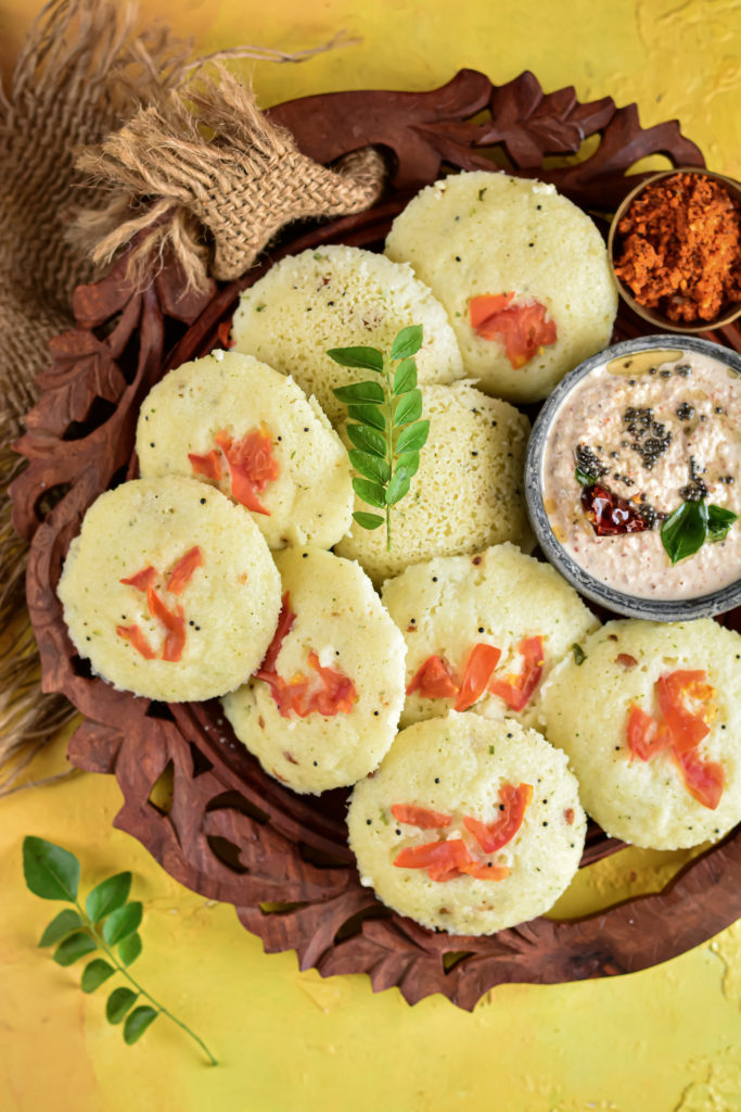 - Take out the idli stand and slide the idlis out from the mold. Serve hot with coconut peanut chutney and podi.