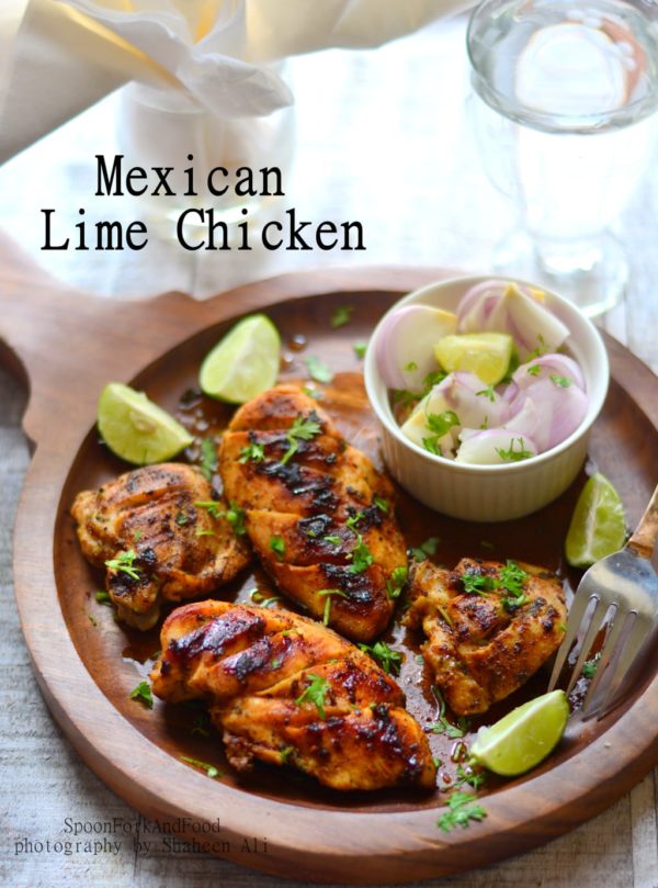 Mexican Lime Chicken is marinated Chicken breasts in lime juice, lime zest, coriander, paprika and grilled either in oven or stove stop grill pan. Mexican Lime Chicken can be served as a starter or a side dish to lovely weekend meal and also a great option to serve in your brunch parties. Mexican inspired recipe is simple yet very appetizing. Lime juice and zest when teemed up with coriander and paprika gives an amazing aroma and flavor to the chicken keeping it juicy and soft.