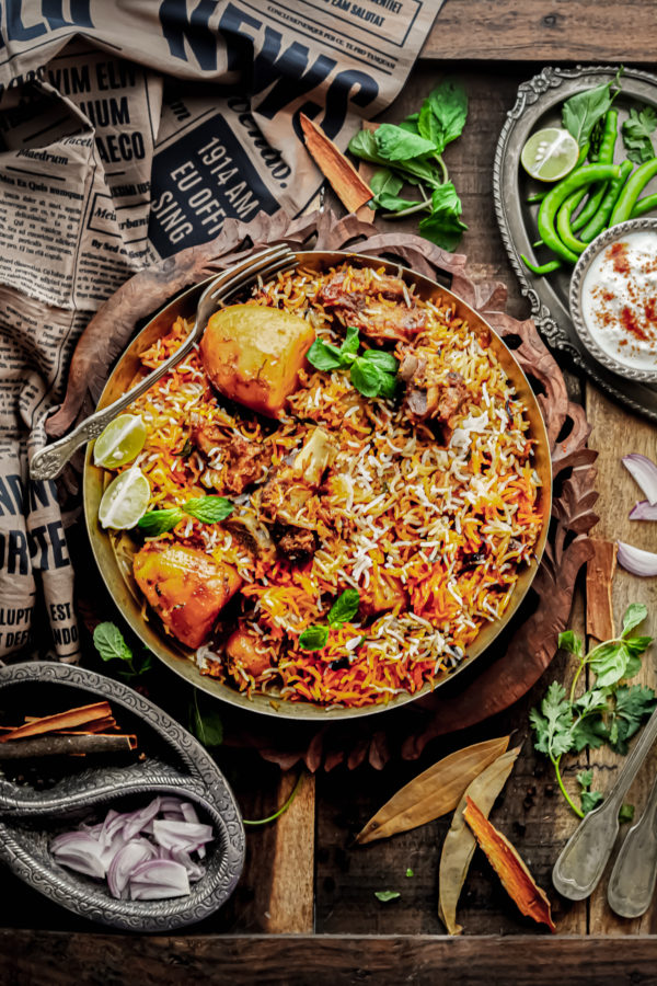 Assembling : Place the mutton handi on a tawa and heat on low flame. Meanwhile add first layer of rice on top of mutton mix. Add fried potatoes over the rice and sprinkle some chopped mint and coriander. Again add the remaining rice as a second layer and finally garnish it with remaining chopped mint and coriander, fried onions, add ghee, some lemon juice, sprinkle food color and close lid. Seal the rim of the handi and lid with wheat flour dough and place some weight on top of the lid. Turn gas on high for 5 mins. As soon as you see steam coming out from the dough at one point, simmer the gas and let the biryani cook on dum for 20-25 mins. You will also see the sealed dough dry and cracked. This means the Biryani is ready. Turn off the gas and wait for 10 mins to settle. Carefully remove the seal, and open the lid. Gently mix Biryani and serve hot with Raita.