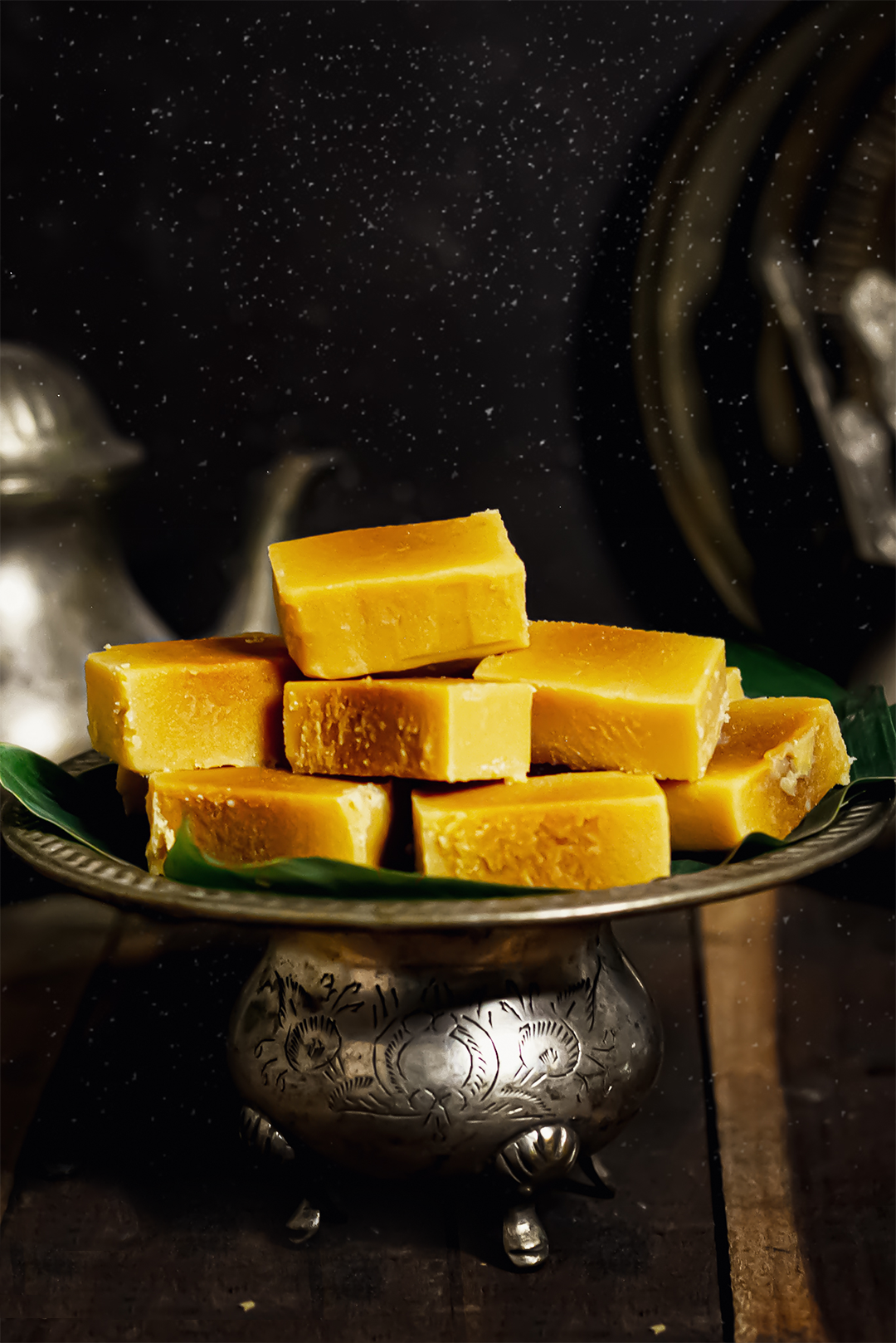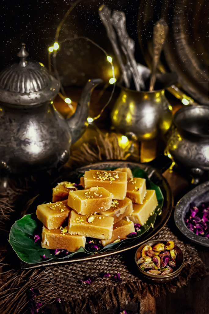 Mysore Pak was first prepared in the kitchens of the Mysore Palace by a palace cook named Kakaasura Madappa out of the above ingredients. The cook at the Mysore Palace kitchen simply made a concoction of gram flour, ghee and sugar. When asked its name, Madappa obviously didn’t have its name in mind, so he simply called it the ‘Mysore Pak’. Pak (or paka, more precisely), in Sanskrit and other Indian vernaculars, means sweet. It is traditionally served in weddings and other festivals of southern India. It is very popular in baby showers too. [wikipedia]