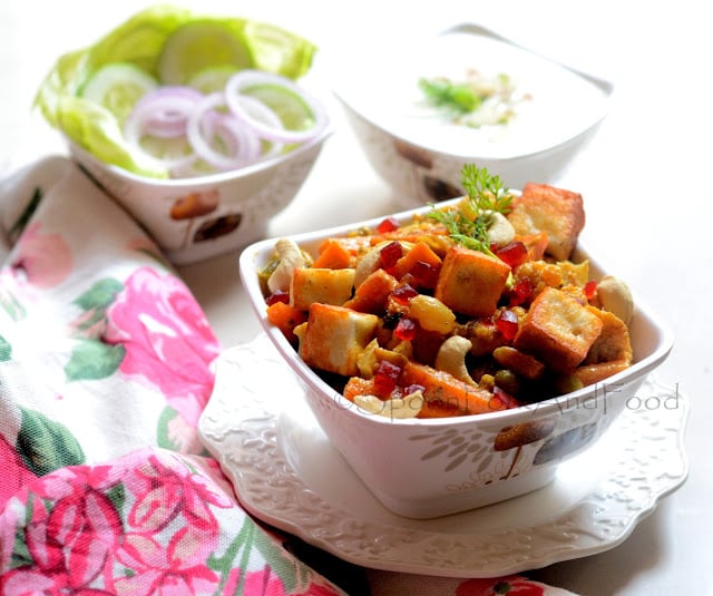 - Add fried paneer pieces from top and garnish with freshly chopped coriander, some split cashews and pomegranate pearls.