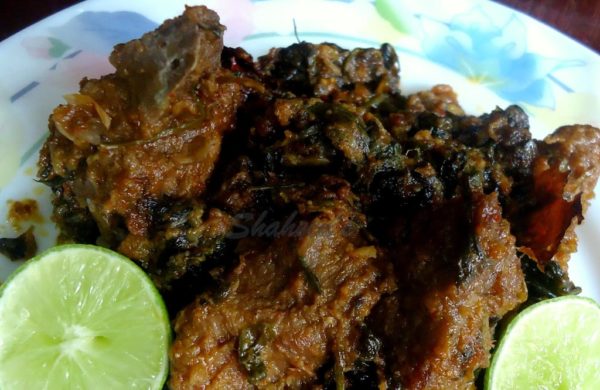 - Mix in salt and chopped spinach and stir fry till lamb is fully mixed with spinach and tender.