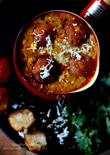 Paneer kofta falls in the same family of Malai kofta. The only difference between the two is that malai kofta is stuffed with fry fruits and cream, so when we cut the kofta , fresh cream/malai oozes out. Whereas paneer koftas are simple fried paneer balls bnded with potatoes and chopped nuts. It’s quick and an idel party menu. I personally like paneer a lot so i really don’t bother much how it’s being served. Unless until it’s paneer…everything is fine to me.