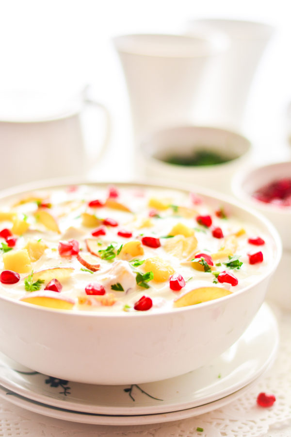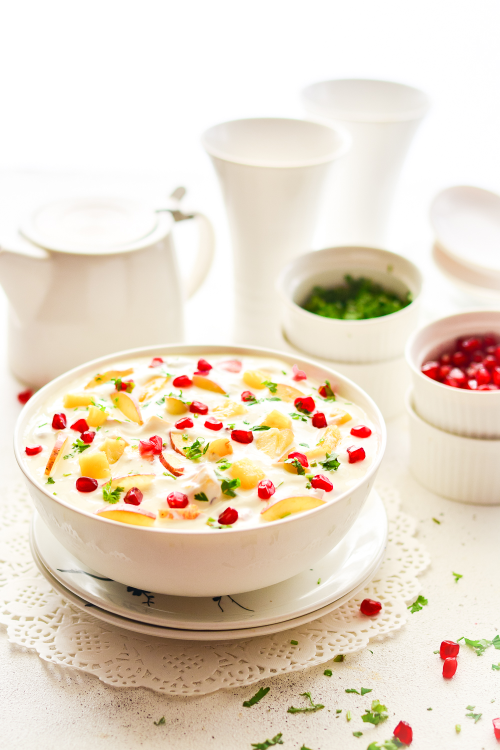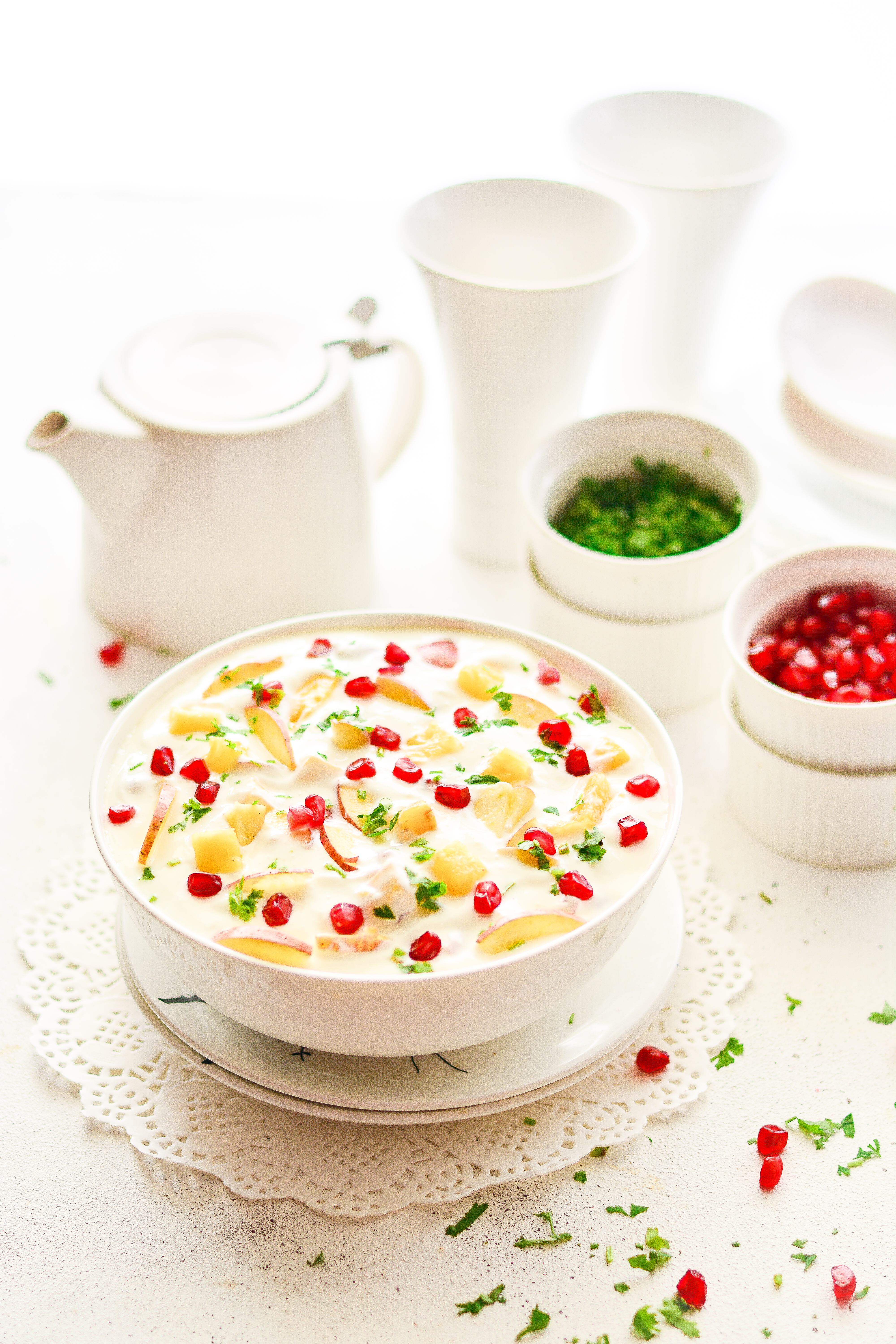 Raita is the most loved side dish in Indian meals. In India every region serves you a variety of Raita with different digestive properties. One of the most popular raita served in Restaurants is Mix Fruit Raita. Thick and creamy yogurt flavored with mild sweet and tangy spice mix is loaded with various mix fruit chunks like Pineapple, Apple, Pomegranate etc. This gorgeous looking Raita tastes best when served with Vegtable Biryani or Pilaf. Indian Restaurants mostly use pineapple, apple and pomegranate in their recipe bt you can create your version and kiwi, grapes etc. It totally depends on one’s preference. As the dish looks colorful it’s loved by children as well. So next time when you have guests at home, try making this Mix Fruit Raita and show off your cooking skills by making then go through a Restaurant style fine dinning experience.