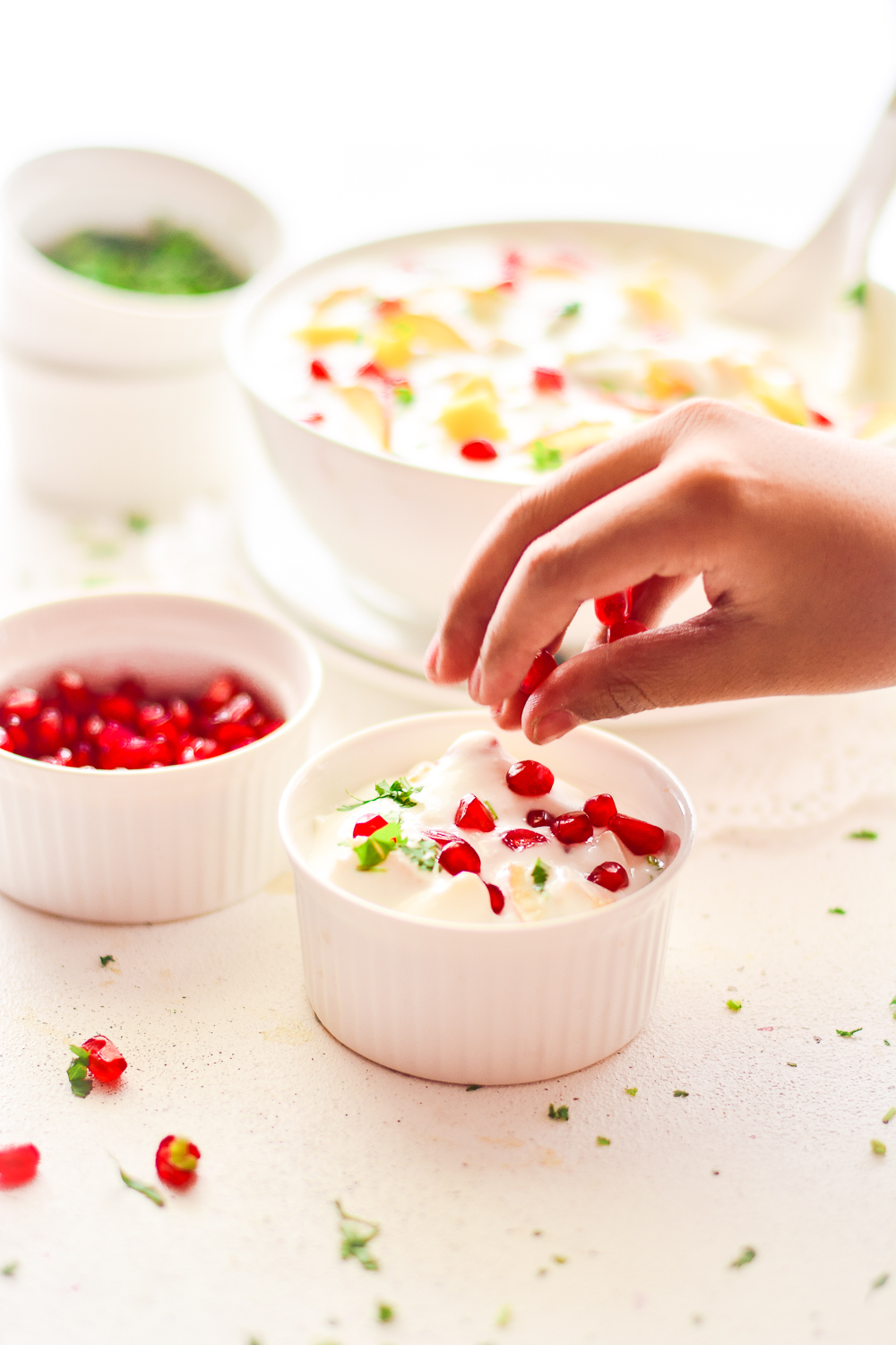 To make this easy Restaurant Style Mix Fruit Raita all you need is some handful of ingredients that are mostly available at homes. I prefer using fresh fruits but you can also use canned fruits and skip adding sugar as they are already sweet because of the syrup. Take fresh thick yogurt in a large mixing bowl and add sugar. Whisk till thick and creamy. Don’t add water to the curd or yogurt because Mix Fruit Raita is usually served thick and creamy. Add fruit chunks and pomegranate pearls along with pinch of chaat masala and fold in gently. Garnish with some fresh chopped mint and coriander leaves and serve cold. Mix fruit raita goes best with Vegetable Pilaf or Veg Biryani.