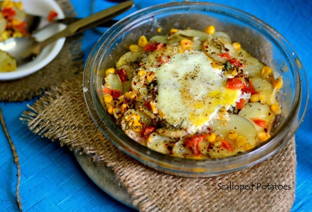One such dish that falls under Gratin is scalloped potatoes. Finely sliced potatoes, cooked in heavy cream n milk, then layered and topped with lots of grated cheese is known as scalloped potatoes. Now i have another member at my home who always love to see colors in his food…yes, u guessed it right, its my son. So i added some corn kernels, chopped tomatoes and an egg before baking. The scalloped potatoes goes well when flavored with rosemary, but as i didn’t had it at home, i chose to season it with some chilli flakes and oregano flakes. It’s easy to make and i’m sure any kid would love to have these creamy cheesy gooey scalloped potatoes with baked eggs on top.