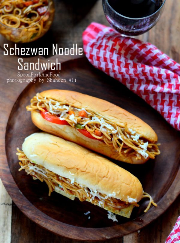 Well its nothing much, just a fancy looking sandwich that is made with schezwan noodles, some veggies to go along and cheese. Now isn’t that amazing! Ciabatta stuffed with veggies, cheese and schezwan noodles makes a perfect sandwich which is not just delicious but also an excellent fusion dish specially if you have plenty of noodles left from last night’s party (wink wink). Just a few handful of ingredients and you are done with a super looking continental dish that will certainly make you the star of your kitchen among your friends and family.