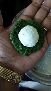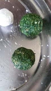 - Pinch the spinach mix and shape it a disk with your hand. Place one paneer ball in the center and cover it with spinach mix from all sides.