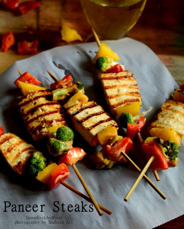 There are two main seasons when you can enjoy hot snacks and appetizers along with the climate…. Monsoon and Winters. There are couple of months left for the winters to arrive but Monsoon has certainly arrived at our door step and giving enough opportunities to us to enjoy savories and mouth watering appetizers. One such all time favorite monsoon appetizer at my home is Grilled Paneer Skewers or Steaks. I have a potable BBQ at home, but sometimes just find myself too lazy to get that working. But nothing worries me till i find any substitute for that, and here in this case the substitute for my BBQ is my very humble stove top. Yes, you heard me right, today i shall be sharing the recipe of Paneer Steaks made on stove top.