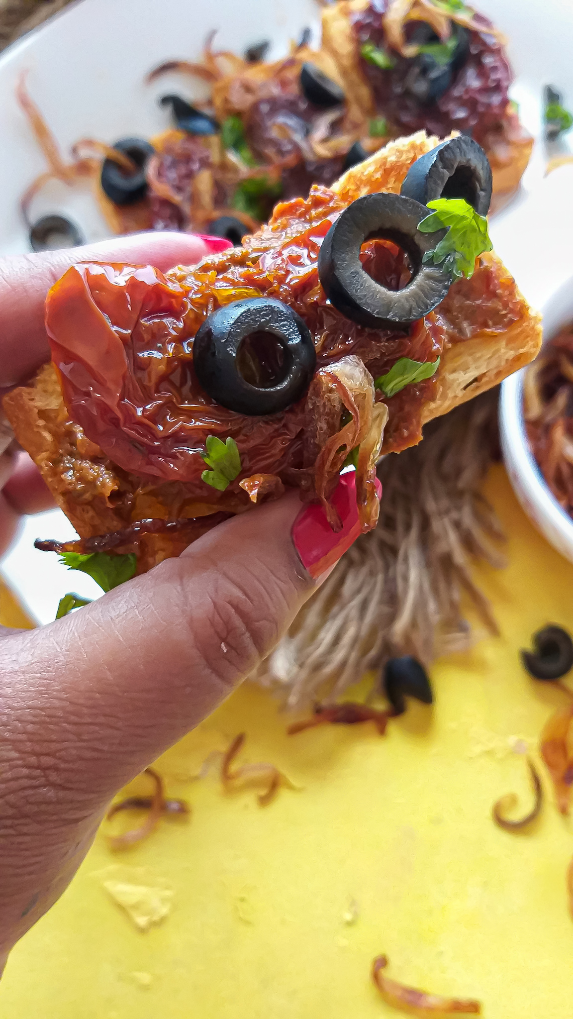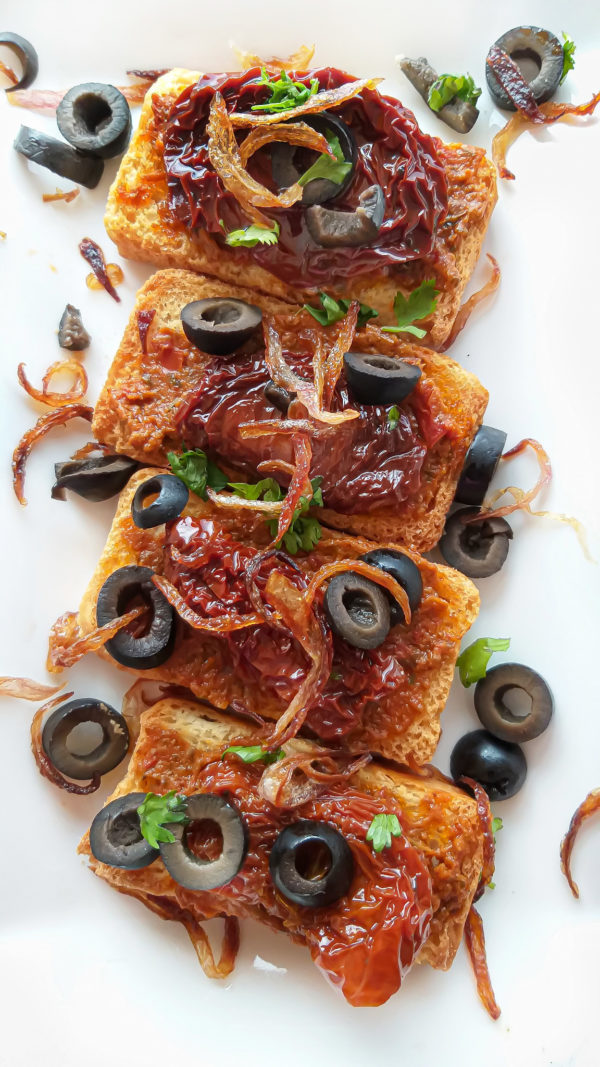 Bruschetta is an antipasto from Italy consisting of grilled bread rubbed with garlic and topped with olive oil and salt. Variations may include toppings of tomato, vegetables, beans, cured meat, or cheese. Sun Dried Tomato & Olive Bruschetta With Crispy Onions is a great snack recipe made easily with handful of ingredients and some creative mind. Bruschetta is an ideal party starter or can even be served in brunch or cocktail parties. Bruschetta originated in Italy during 15th century. However, stems of the dish can be traced back to Ancient Rome, when olive growers would bring their olives to a local olive press and taste a sample of their freshly pressed oil using a slice of bread. A popular dish is bruschetta with tomatoes; one recipe popular outside Italy involves basil, fresh tomato, garlic and onion or mozzarella. Bruschetta is usually served as a snack or appetizer. In some countries, the prepared topping is marketed as bruschetta. (wiki)