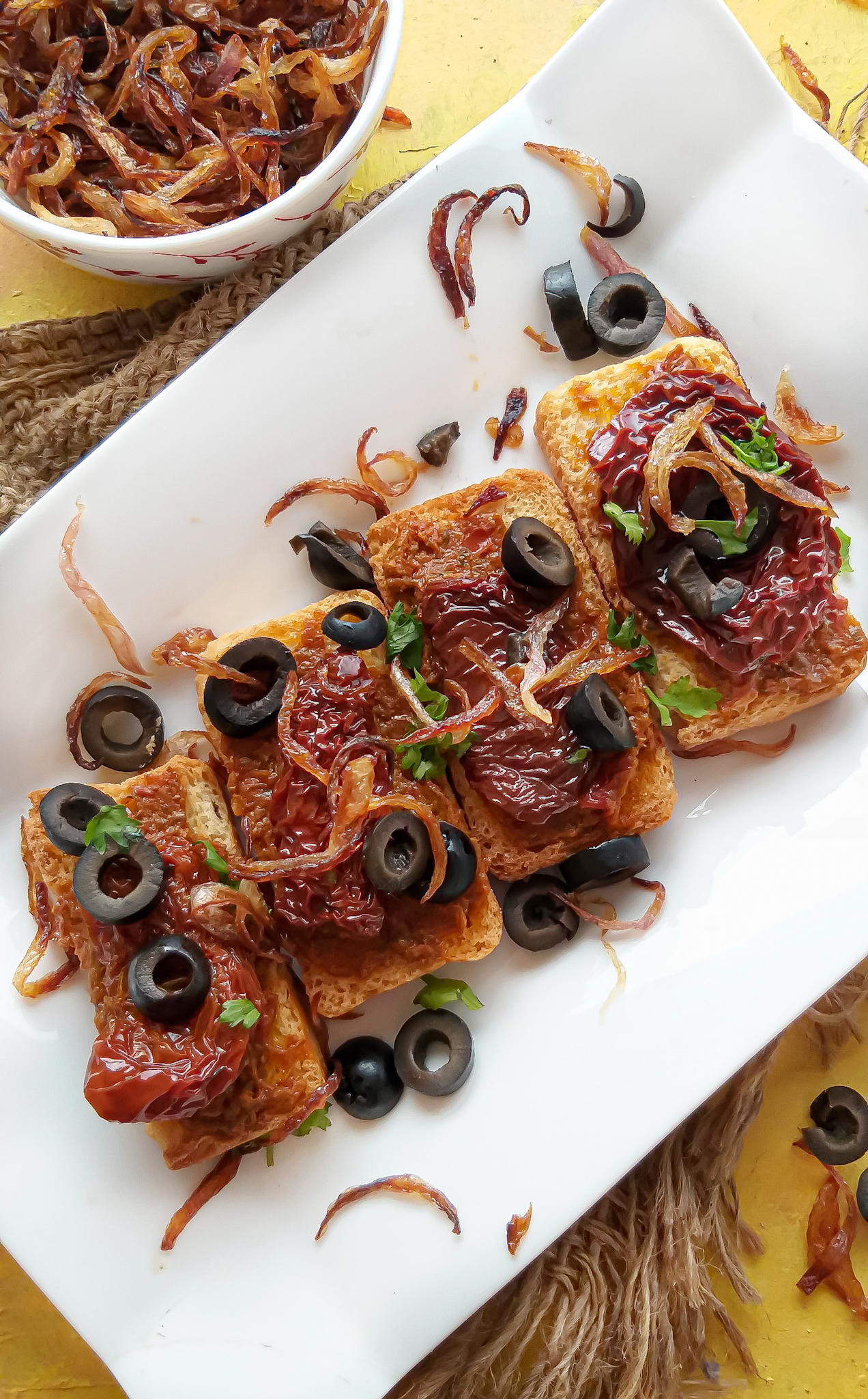 - Top the toasted bread with the mix and sprinkle some fried onions all over.
