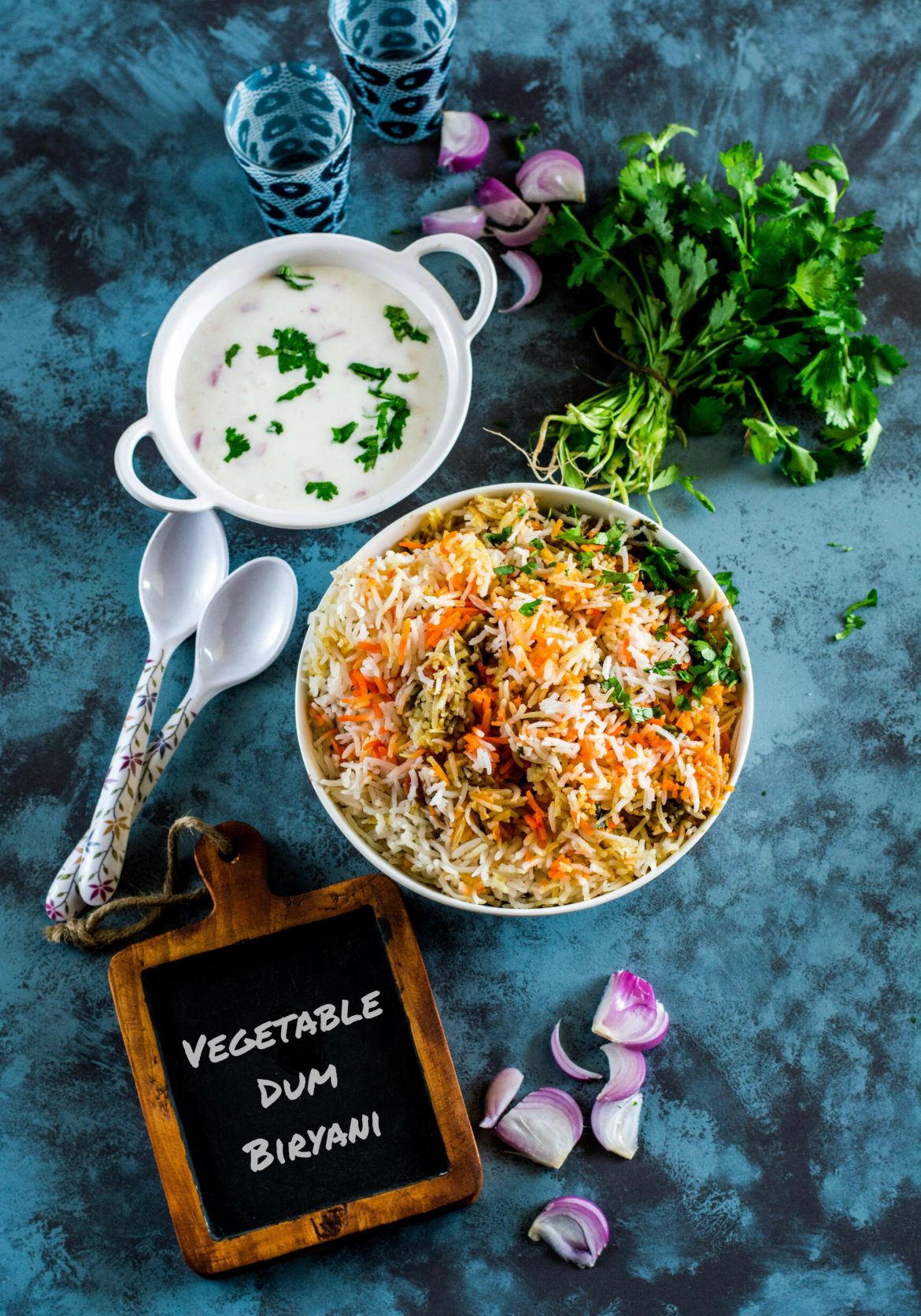 Wash and soak rice in fresh clean water for 45 mins before cooking. Now take enough water (double the quantity of rice) in a thick bottomed pan and add rice along with 1 stick cinnamon, few black pepper and cloves, salt and 2 tbsp ghee. Cook rice till it’s 80% cooked. Strain water and collect the rice in another flat bottomed tray and keep aside. Heat ghee in a thick bottomed pan or handi and add 2 sliced onions and fry till golden in color. Collect the fried onions in a plate and keep aside. In the remaining ghee add whole spices and wait till they splutter. Make sure they don’t burn. Now add rest 2 sliced onions and fry till they sweat. Add in the ginger and garlic paste along with some slit green chilies and fry till golden in color. Now add in the fresh cut vegetables and mix well to fry. Meanwhile take 1 cup of curd and add coriander powder and red chili powder in it and make a smooth paste. Pour in the prepared curd mix into the vegetables and mix well. The curd will start leaving water from sides so don’t add extra water in the pan to cook the vegetables. Adjust salt as per taste and Fry the vegetables with curd mix on high flames till the ghee starts leaving out from the sides. Once the vegetables are partially cooked, let’s start layering the biryani and keep it on dum. Take a thick bottomed handi or pan in which you want to cook the final biryani. Spread around 2-3 tbsp of fresh curd on the bottom of the pan, This wont stick the rice on the surface. Divide the cooked rice into three portions, and spread the first portion of rice in the bottom of the pan. Now take the left over curd and spread it all over the first layer of rice. Now again spread the second portion of rice evenly and then add the cooked vegetable yakhni on top of the second layer of rice. Lastly spread the third portion of rice all over the yakhni covering it completely. Whisk fresh cream or home made malai in a bowl and spread all over the last layer of rice. Now top the biryani with fried onions, finely chopped mint and coriander and some green chilies. Sprinkle some lemon juice all over (optional) and spread saffron soaked milk on top. Take the wheat flour dough and make a thick ribbon out of it and place it on the rim of the pan/handi and close the lid of the handi pressing it gently such that the dough seals the hand completely from all sides. Place a heavy bowl or “sil batta” on the top of the handi to ensure the aroma is intact. Let the Biryani cook on dum for next 30 mins or till the dough is cooked and gets hard. Now open the lid carefully and mix the biryani from one side. Serve hot with onion and mint raita along with some salad and enjoy!