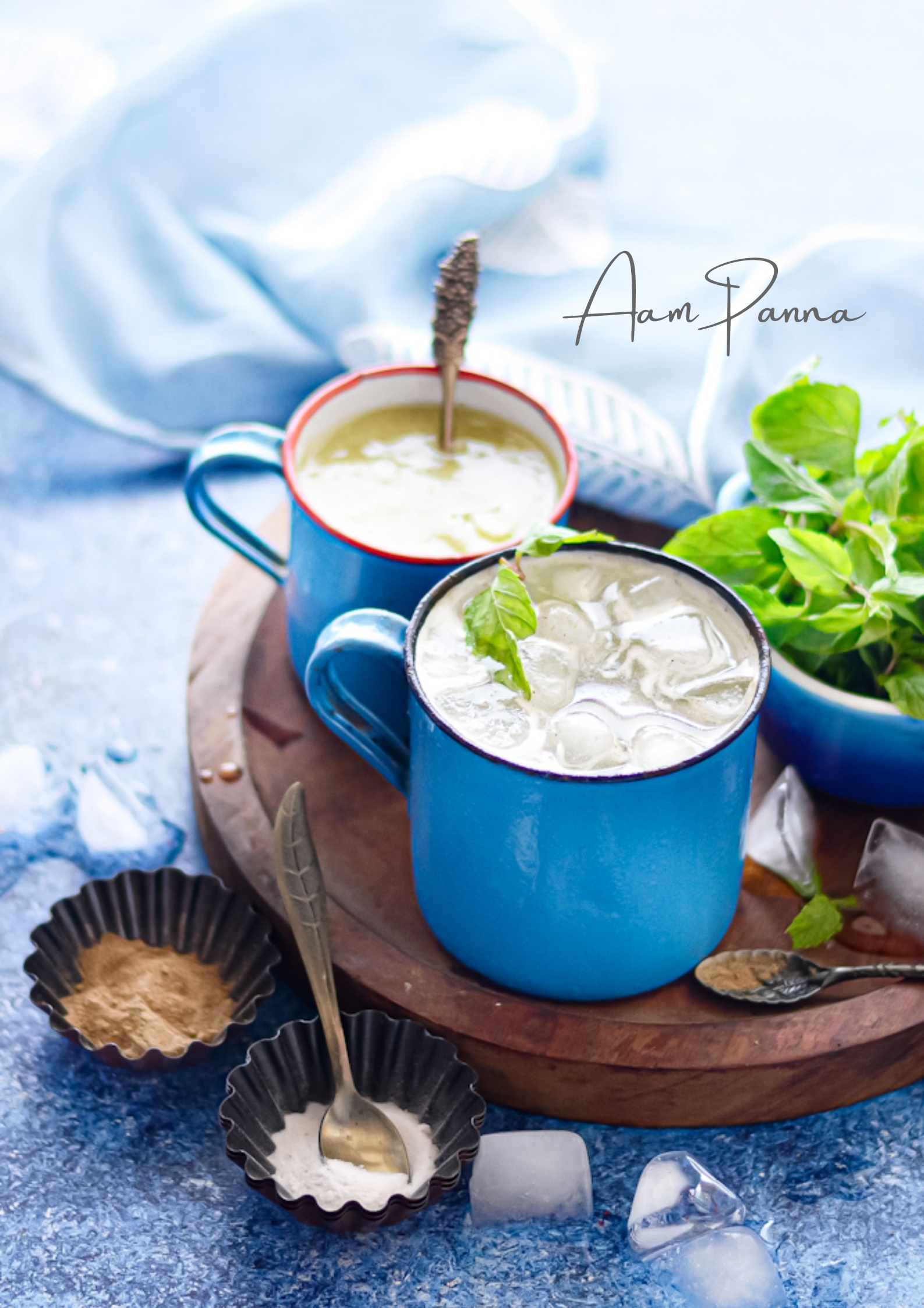 Basically there are two versions of making Aam Panna. One is Raw mangoes boiled or pressure cooked until soft and pulpy. Later mixed with spices and stored. Second is roast Raw mangoes until the inside pulp is soft and mushy, spice it up and store.