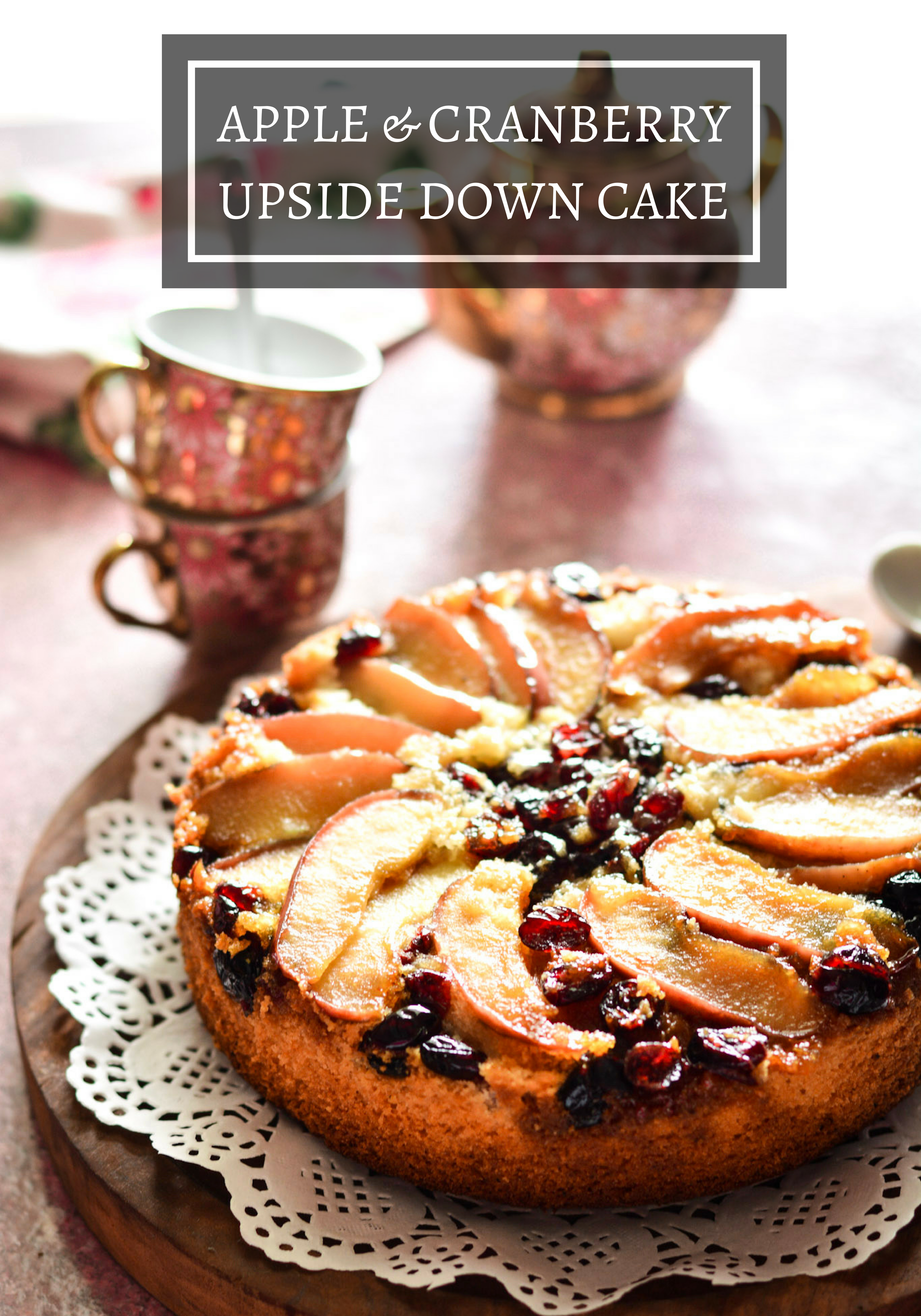 Apple & Cranberry upside down cake is a perfect tea time cake and a dessert for your evening monsoon parties. Just when apples are in season this is the right time to get your hands into baking and brace yourself with some baking therapy. Upside down cakes are easy to make but tricky to get perfect. After a lot of trial and error i learnt the trick to get the cake out in a good shape. If you try to reverse the cake when it’s too hot, the cake will definitely go for a toss and all your hard work will go for a ride. And also if you get the cake out after it’s completely cool, then there is a wide possibility for the caramel and the fruits layered below to get stuck in the base. Hence the perfect way to de mould the upside down cake is within 10 minutes. Yes, you heard me right, just take your cake out of the oven and let it rest for a good 8-10 minutes. As i always advise to use spring form pan, your work certainly gets easier. Just release the spring and remove the side case, carefully flip the cake with the bottom tray and gently remove it such that the fruits doesn’t stick in the bottom.