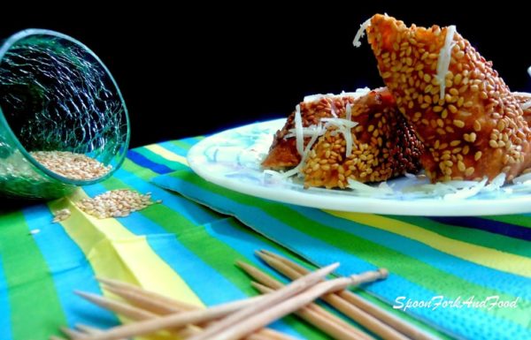 - Now as your rolls are ready, take one roll and dip into cornflour solution and coat it with sesame seeds and keep aside.