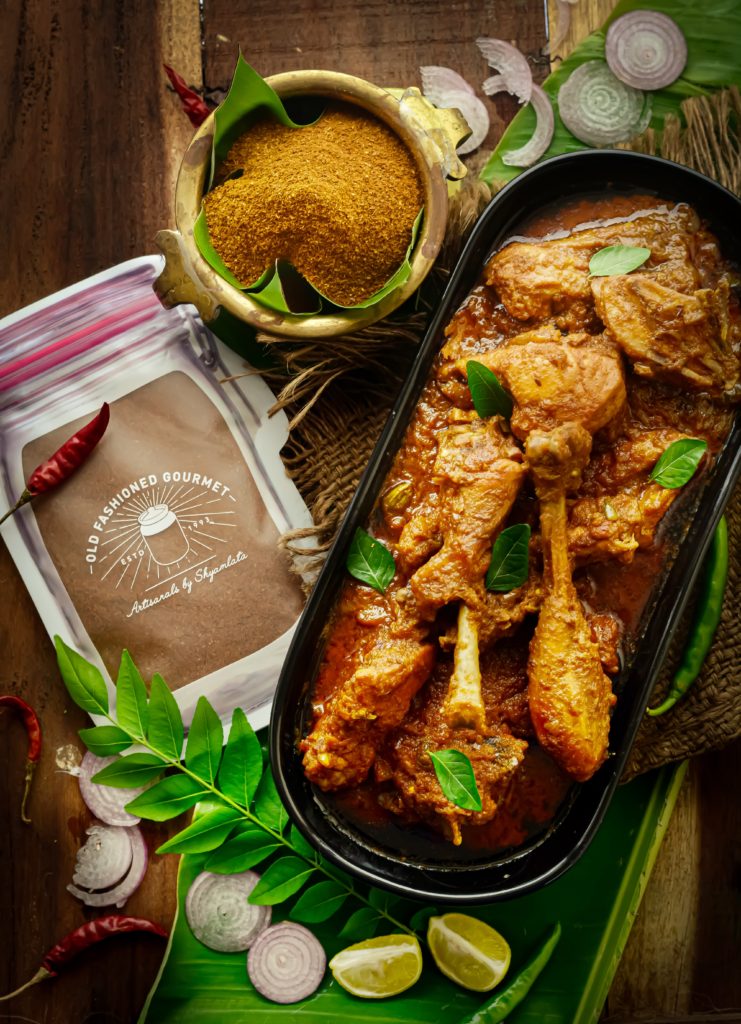 Chettinad Cuisine from Tamil Nadu is one of spiciest cuisines in India and Chettinad Masala is a robust spice mix used to make this cuisine, both veg and non veg. Chicken Chettinad is a classic Indian recipe, from the cuisine of Chettinad. It consists of chicken marinated in yogurt, turmeric and a paste of red chillies, kalpasi, coconut, poppy seeds, coriander seeds, cumin seeds, fennel seeds, black pepper, ground nuts, onions, garlic and gingelly oil. I have skipped all the above spices and used Chettinad Masala by Old Fashioned Gourmet. Old Fashioned Gourmet by Aravali Foods is an initiative to revive heirloom recipes and bring to you Handcrafted, Homemade, Artisanal Pickles and Spices ,that taste like nostalgia and often bring back food memories from your childhood.