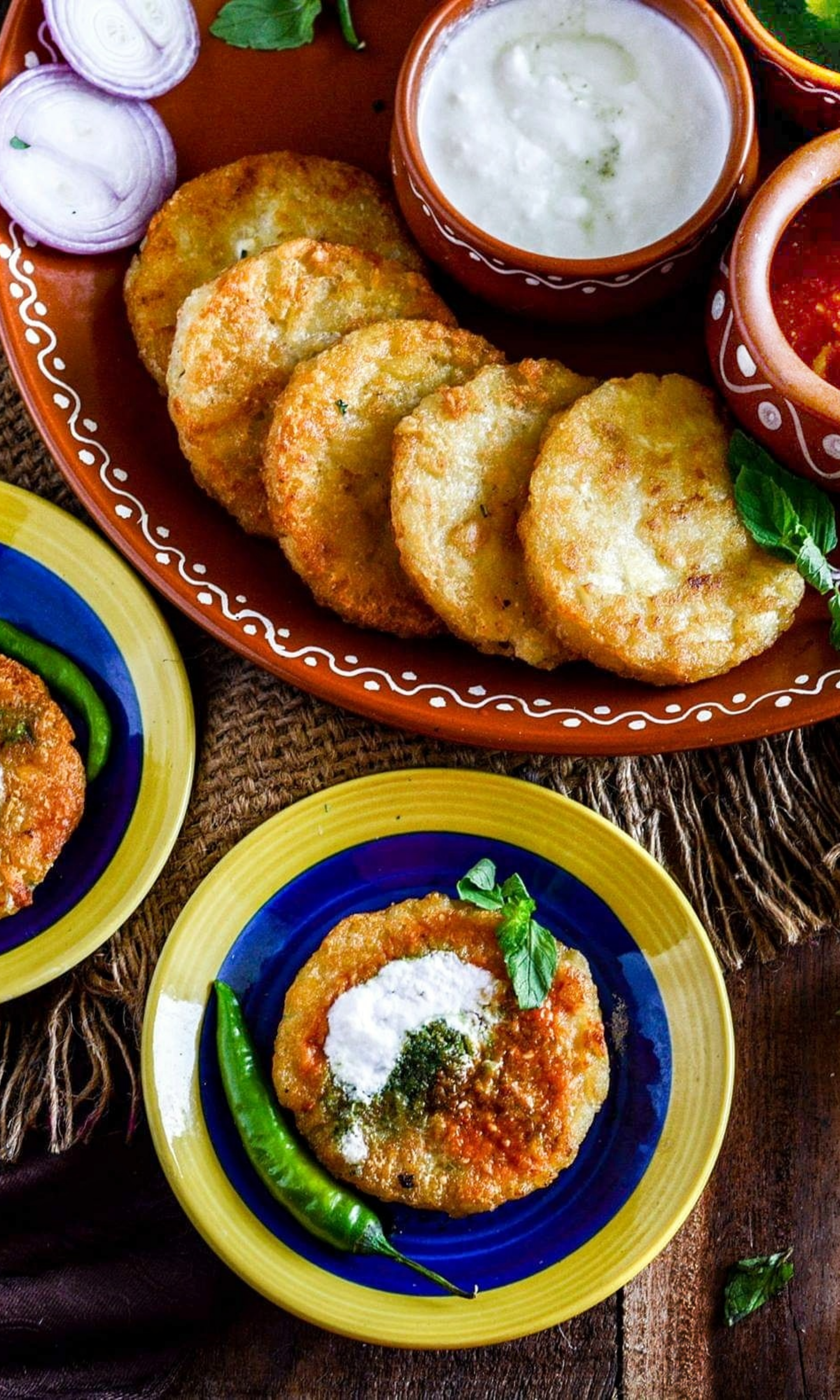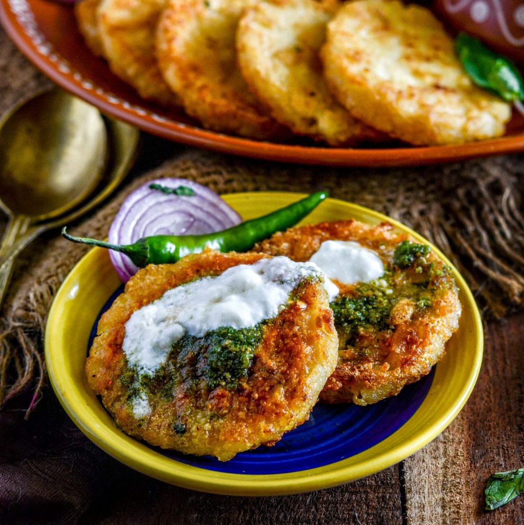- Carefully transfer the fried aloo tikki on the serving plate and top it with some fresh curd, tamarind chutney, mint chutney, chaat masala and pomegranate pearls. Enjoy your Aloo Tikki Chaat along with rains and a hot cup of Chai.