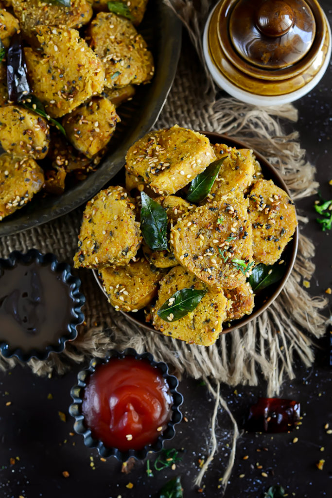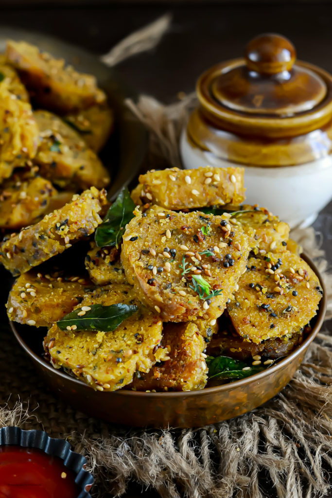 Muthia can be made with various vegetables like Bottle gourd, cabbage, carrot etc. Out of many recipes Karela/Bitter gourd muthia is my all time favorite. Karela Muthia is a steamed and shallow fried snack that comes from Gujarati Cuisine. Gluten free and diabetic friendly , rich in carbohydrates and less in fat, healthy munching snack that can be enjoyed as an appetizer or even cooked in a curry. Grated bitter gourd, mixed with gluten free flours and Indian spices is mixed to make a dough which is later steamed and cut into pieces. The pieces are later tempered and served with tangy tamarind sauce. Karela Muthia is ot just healthy but is also very nutritious and a perfect snack option for fussy kids.