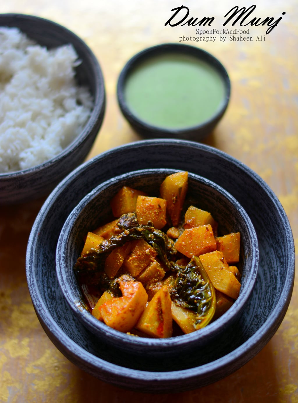 Dum Munj Or Dum Monji is a spicy flavorful veg curry that comes from Kashmiri Cuisine. Munj here means Knol Khol also commonly known as Ganth Gobhi or Kadam is cur into cubes and cooked with it’s greens along with some yogurt. The recipe though is quick but requires skillful hands to play with Kashmiri spices which particularly are fennel powder, asafoetida, sonth or ginger powder etc. Kashmiri food is rich in texture and aroma as there is a wide usage of Mustard oil which itself provides a beautful aroma and kashmiri red chili powder also known as deghi mirch gives a rich color. Dum Munj is typically eaten with boiled rice.