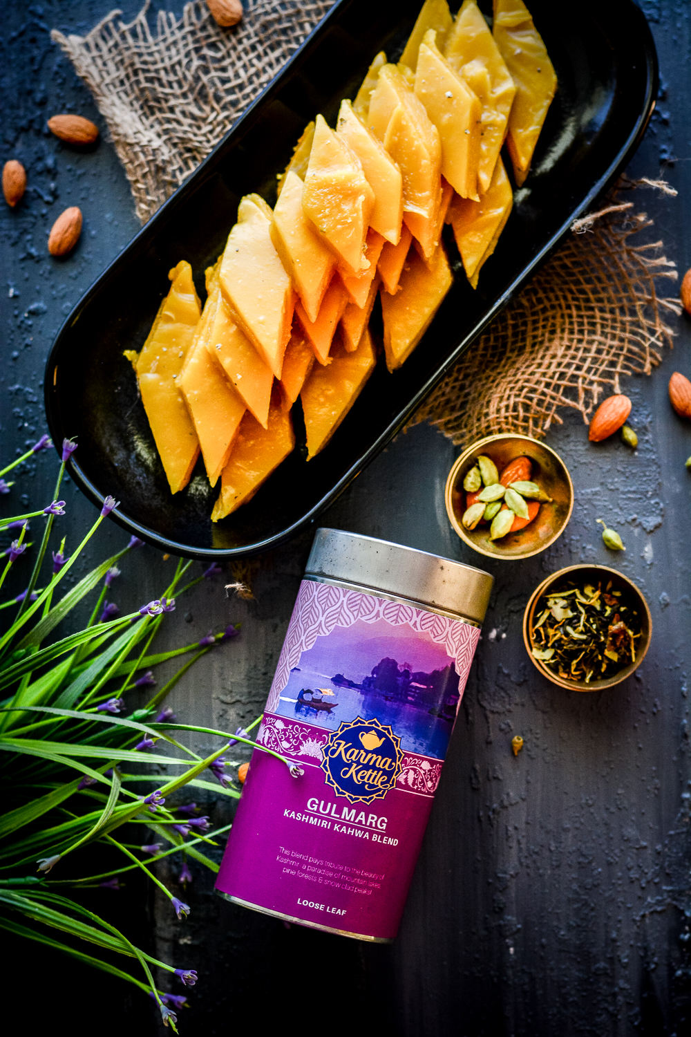 To make this Kahwa Flavored Almond Fudge boil 1/2 tea cup of water and soak one Karma Kettle’s Gulmarg Kashmiri Kahwa tea bag for 1-2 hours. Discard the tea bag and keep the liquor aside. Grease a flat tray with oil or ghee and keep aside. Sift almond flour and collect in a mixing bowl. Add 1/2 cup of oil along with 2-3 tbsp of Kahwa liquor prepared. Stir and make a smooth batter and keep aside. You can adjust flavor as per your taste. Heat sugar and water together and boil to make a syrup of one string consistency. In another pan simultaneously heat ghee with remaining 1/4 cup oil. Once the syrup is ready add in the flour batter and keep stirring to avoid lumps. Now add the ghee and oil mix and again stir continuously till the flour combines well and looks smooth and silky. When the flour starts collecting in the center, turn off the gas and immediately pour it on the greased tray and gently tap the tray on the counter so that the mix spreads evenly and the bubbles break if any. Let it cool at room temperature completely and then cut into squares or diamonds as per your choice and serve.