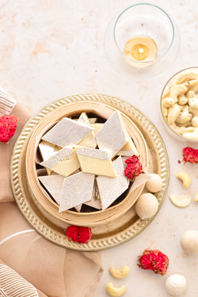 Festivities are all about making home made delicacies, especially a lot of sweets. We Indians definitely go high on sugar during festivals. Diwali is round the corner and I’m celebrating it by making plenty of home made sweets and desserts that I’ll be carrying along during my holiday trip as well. Kaju Katli or Kaju Barfi is one of the most decadent sweet made with richness of cashewnuts and garnished with edible silver leaf.