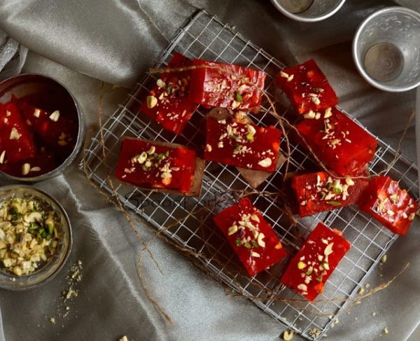 Karachi Halwa | Bombay Halwa is a popular sweet found all across India with different names. I first had this in Ajmer, Rajasthan… I was amazed to see this sweet in almost each and every sweet shop near Dargah. The karachi halwa is not made in any particular color. Saffron, green n yellow are the common colors found in karachi halwa. As diwali is approaching I decided to present various sweet varieties that can be made easily at home and presented in front if your guests this festival. Karachi halwa is one such sweet I wanted to make since long. Just few simple ingredients that can be easily found in your kitchen pantry are used to make this rubbery sweet. It’s also popularly known as cornflour halwa. But you can also replace cornflour with any flavoured custard powder. The halwa made with custard powder won’t give that rubbery texture to it. So its personal choice.
