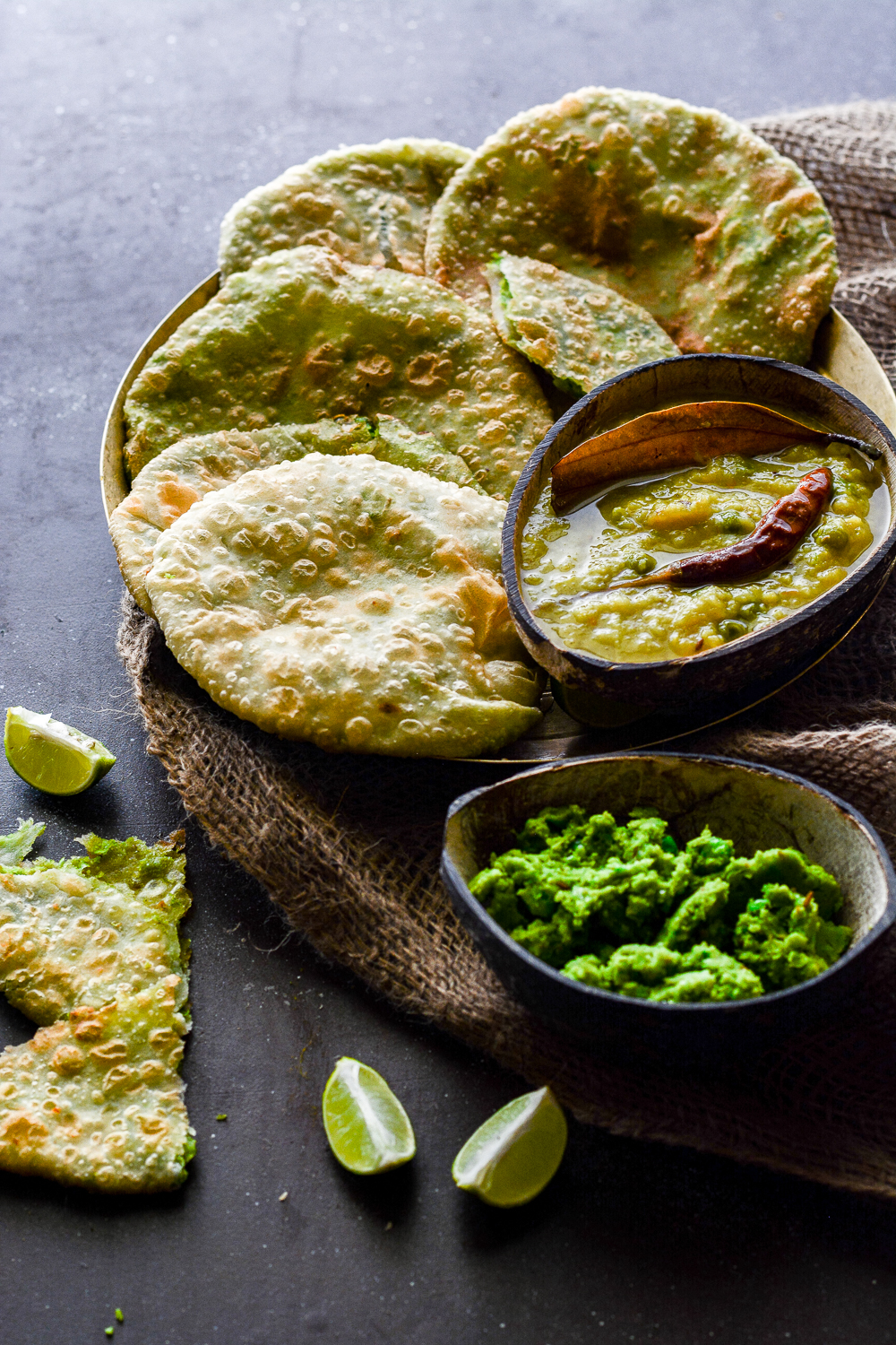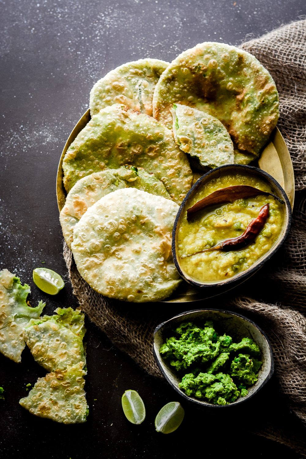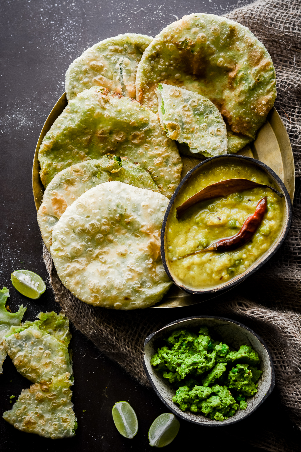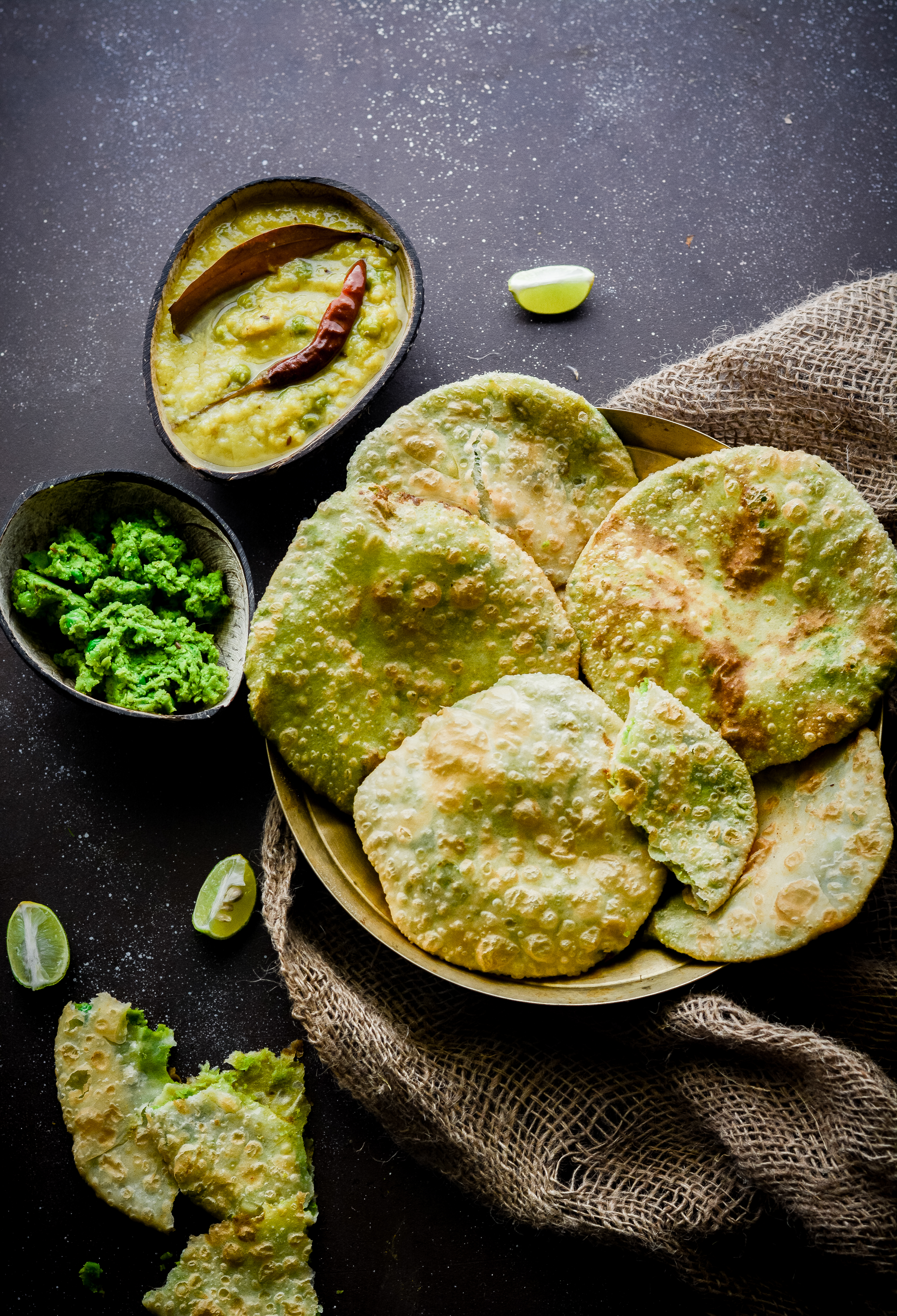 So now coming to our recipe today. As a said earlier too that winter is the best time to eat, sleep and make merry and this is when the local markets flood with all our favorite veggies and fruits as well. One such vegetable that happens to be extremely versatile and enhances flavor in whatever form used is Green peas. Coming from a partial bong background, Bengali cuisine runs into my blood. I’ve grown up eating some of the finest Bengali dishes made by my mom and now it’s an honor to share her recipe with you all. One of my favorite winter snack from her kitty is Koraishutir Kochuri also known as Bengali Matar Kachori. Coarsely/Finely ground green peas as flavored with hand picked spices and sauteed to make a stuffing which is later stuffed into a puri sized kachori made with all purpose flour and deep fried till its puffed and golden in color. Koraishutir kochuri is best served with Cholar Dal, Aloor Dom or any of your favorite chutney.