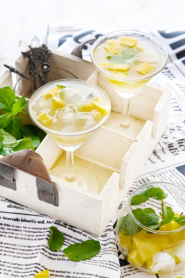 - Add some fresh chopped mangoes and pour in plenty of coconut water till the rim of glass.