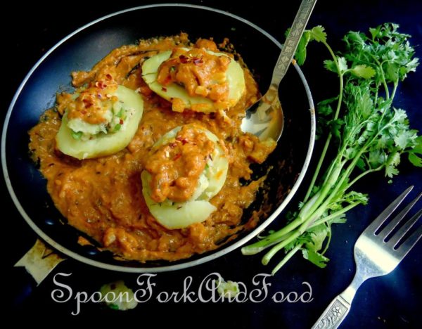 - Now carefully add the stuffed potato halves into the gravy and garnish with chopped coriander.