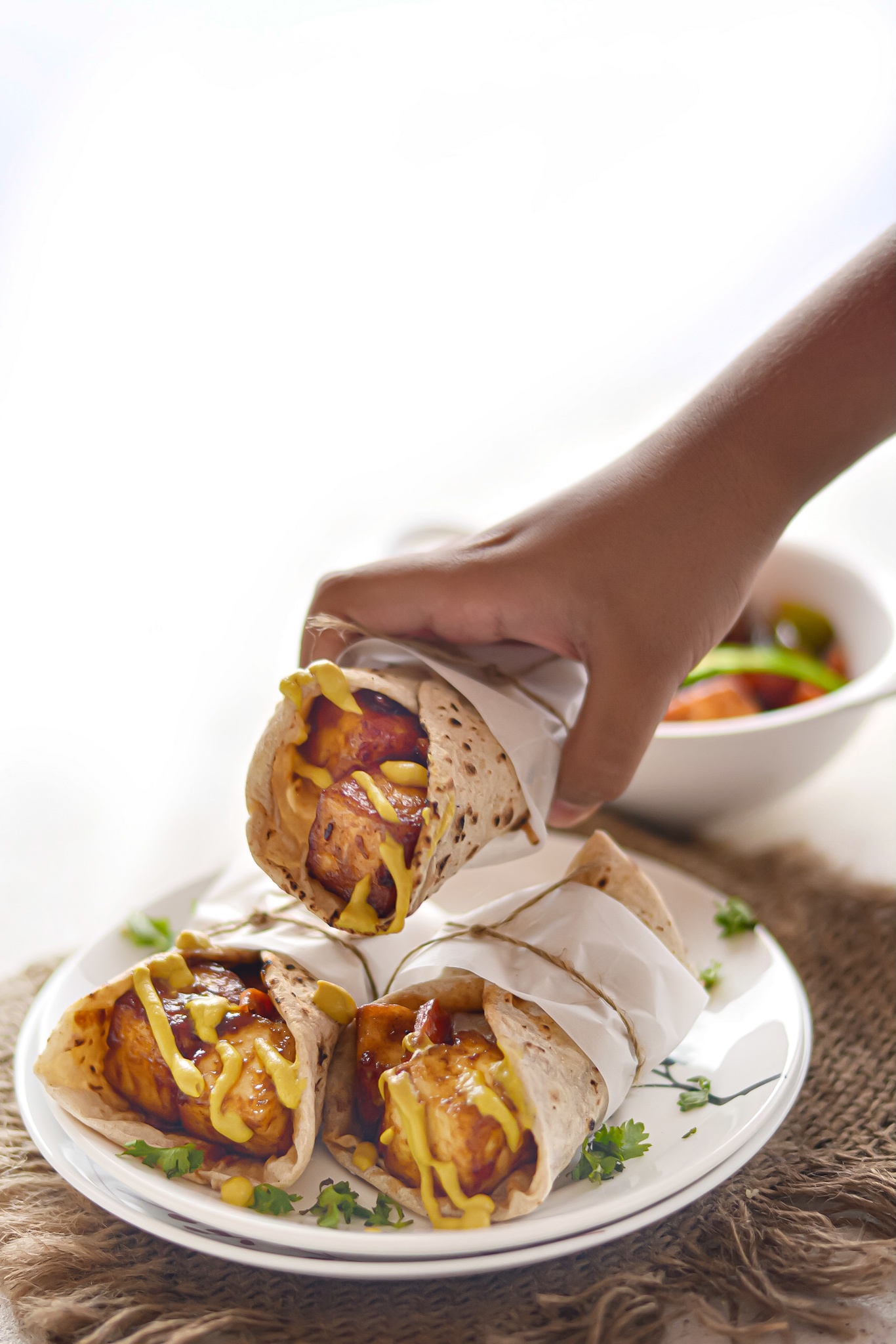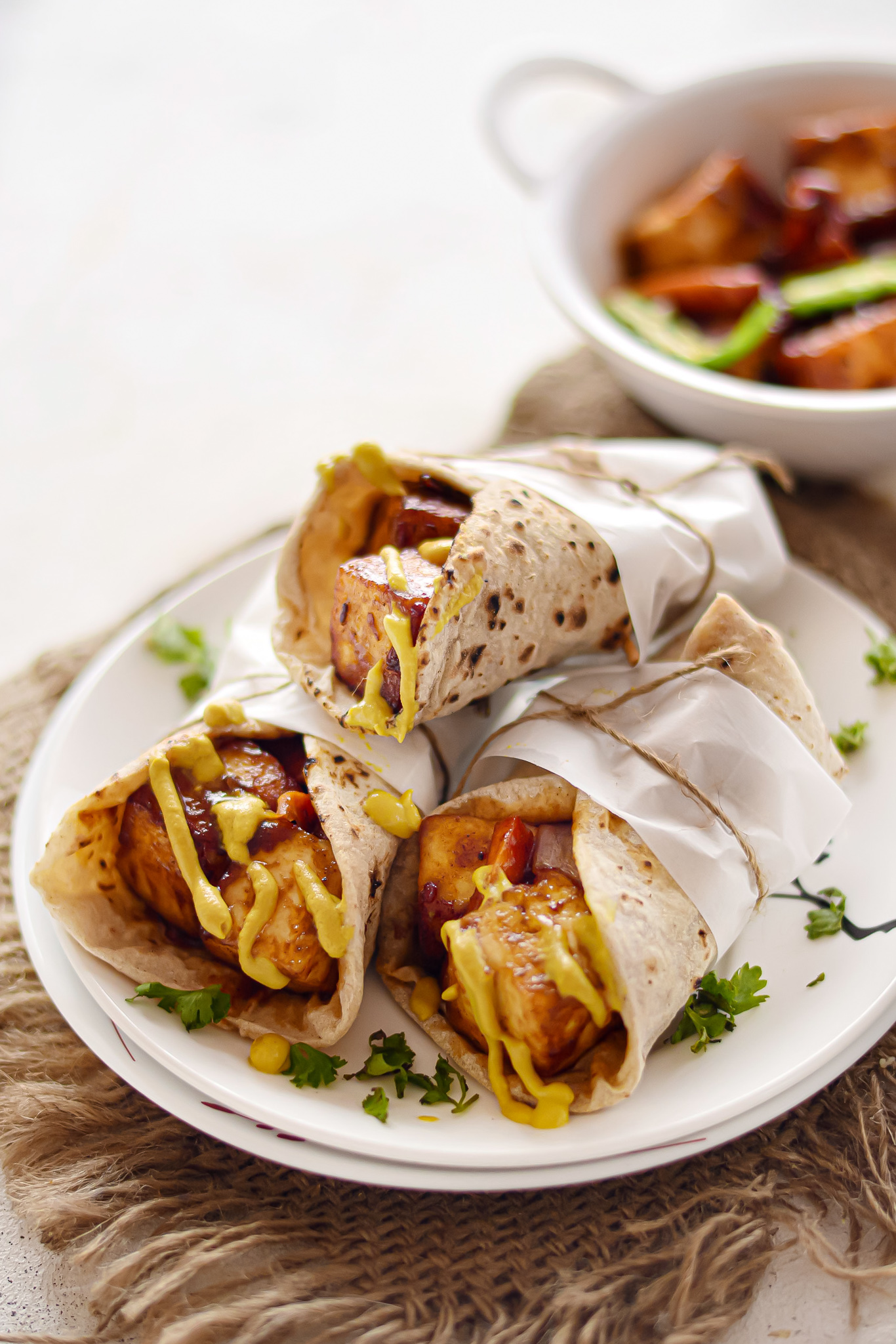 3. Place spoon full of paneer chili in the center and drizzle some mustard sauce over. Wrap the roti to secure the filling and serve immediately.