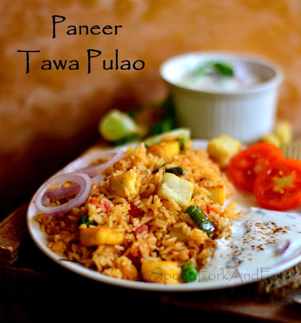 Tawa pulao is another great option if you have left over rice at home. Just few handful of ingredients and this lip smacking pulao is ready to serve. It hardly takes 5 mins, so it is again a great option for those who panic when sudden guests arrive. Regular tawa pulao is made with begetables and pav bhaji spice blend, but i had some paneer left over as well, so i added fried paneer chunks into it to make it taste even more awesome, and yes, kids gonna love it too… 😉