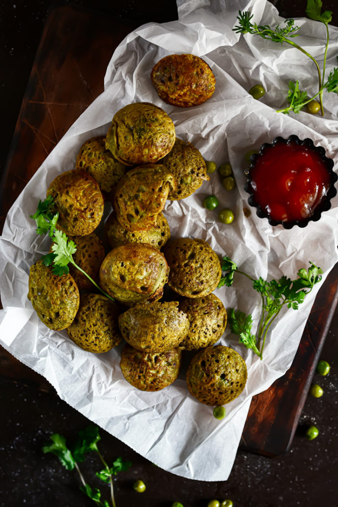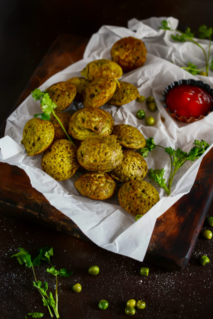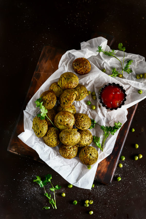 Coarsely grind rolled oats and collect aside. Dry roast semolina until fragrant and keep aside. Mix oats and semolina together and add spinach puree, fresh green peas, cumin powder, green chilies, grated ginger, fresh chopped coriander, salt, cooking soda and yogurt. Combine to make a flowing batter. (Add water if the batter is too thick). Heat a paniyaram pan and add few drops of oil in each section. Now add spoonful of batter into each section and close lid. Cook for 3-4 mins on low flames and then flip to cook the other side too. Insert a tooth pick inside and cook till it comes out clean. Serve hot with any of your favorite dip or may be a simple tomato ketchup.