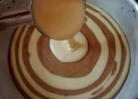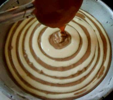 - Add 3 tablespoons of plain batter into the middle of the baking pan. Then add 3 tablespoons of cocoa batter and pour it in the center on top of the plain batter. Repeat this until the batter is all done, do not stop and wait for the previous batter to spread, keep going.... as shown in the pics below.
